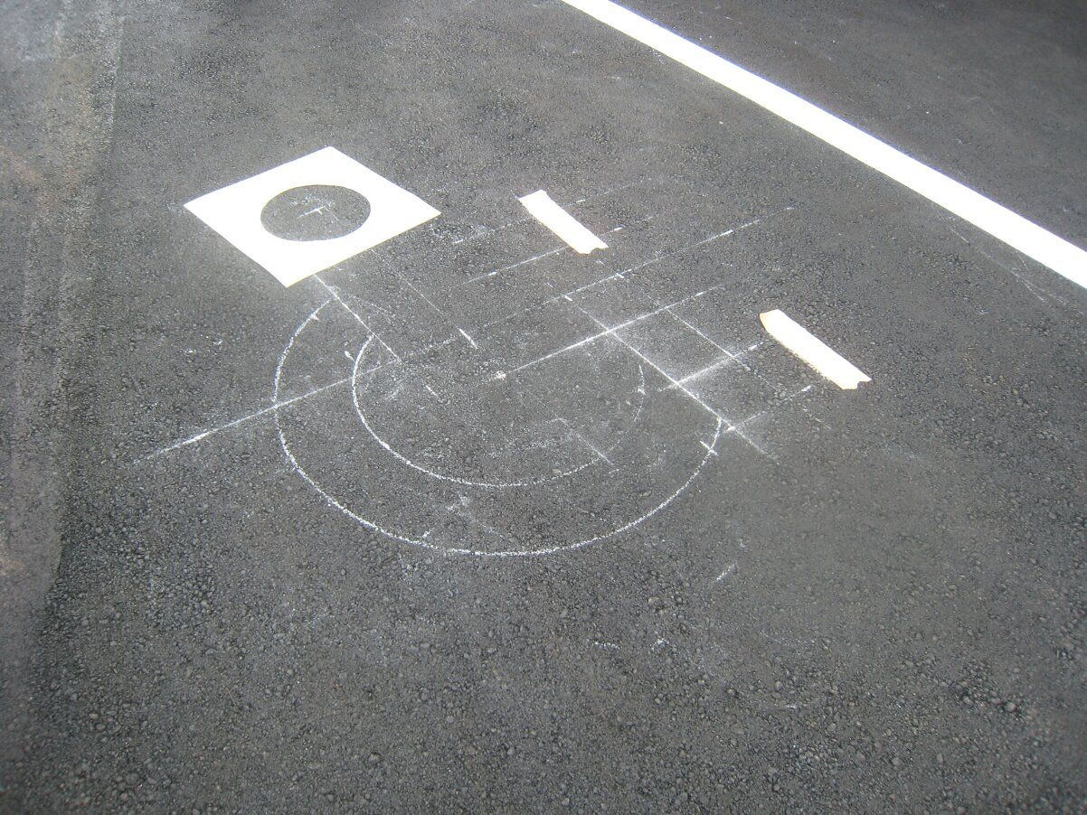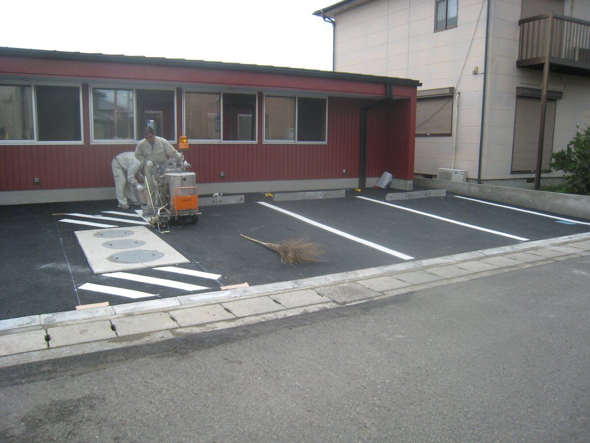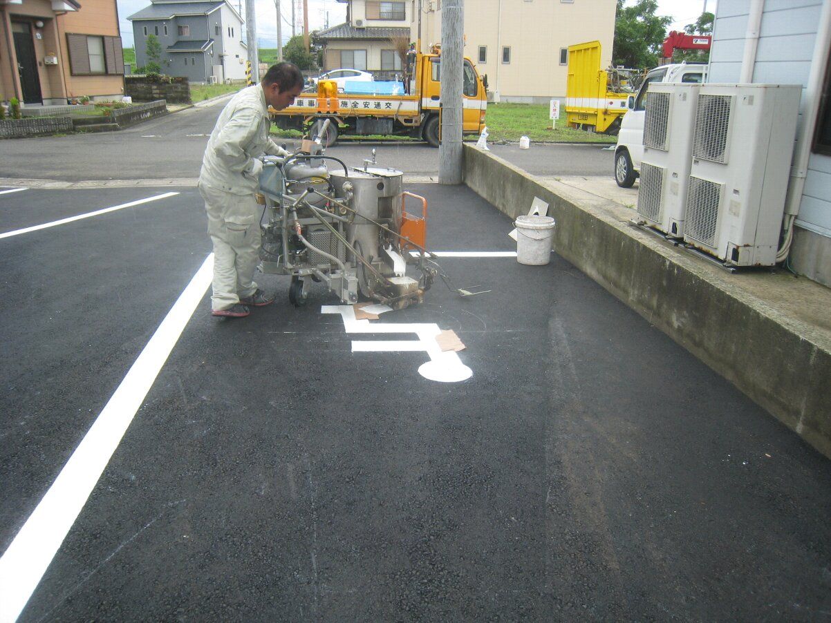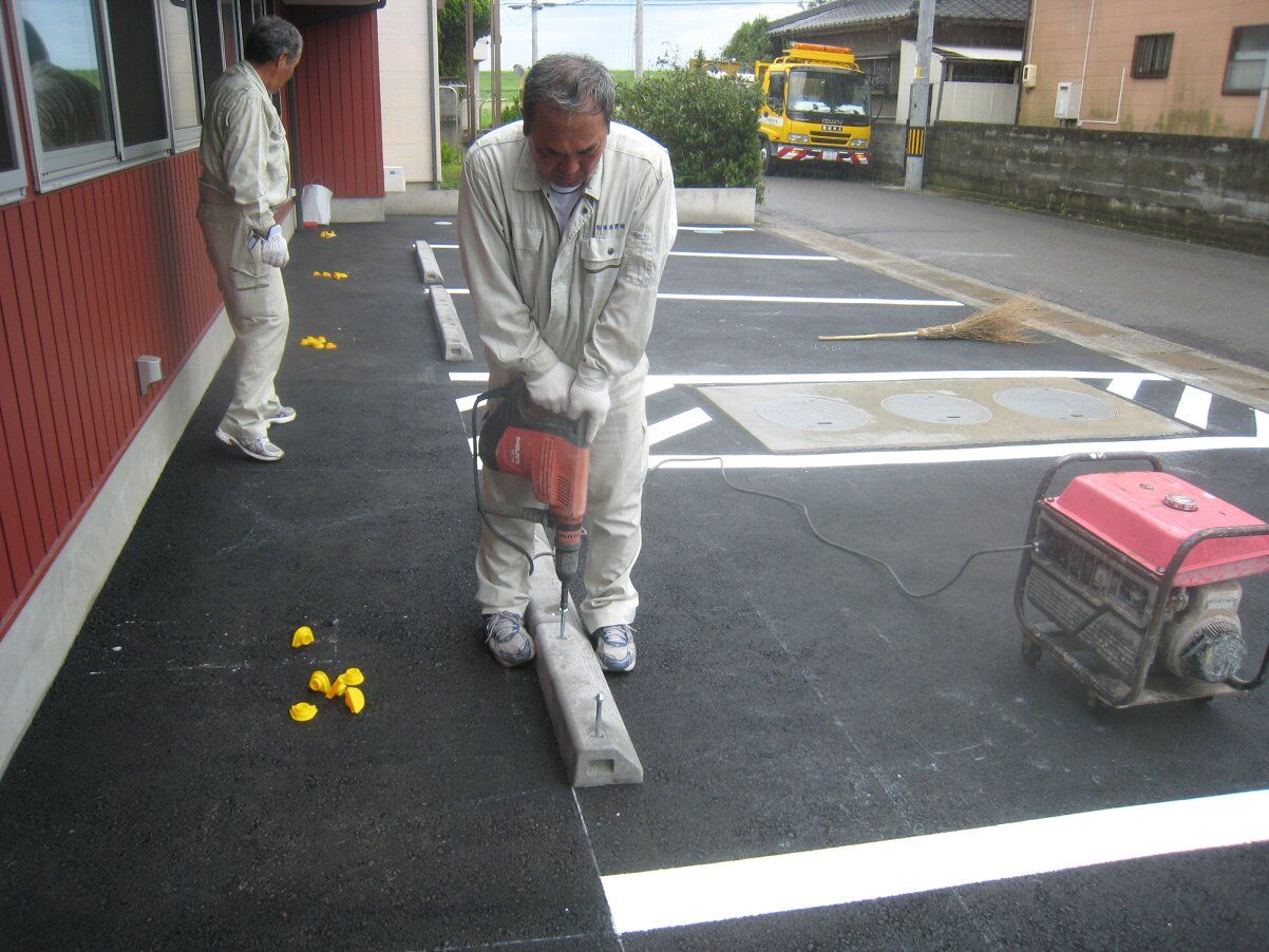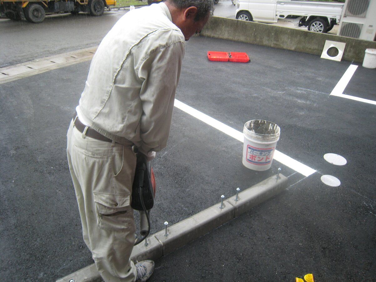 車止めの位置決めのあと、白線引きです。