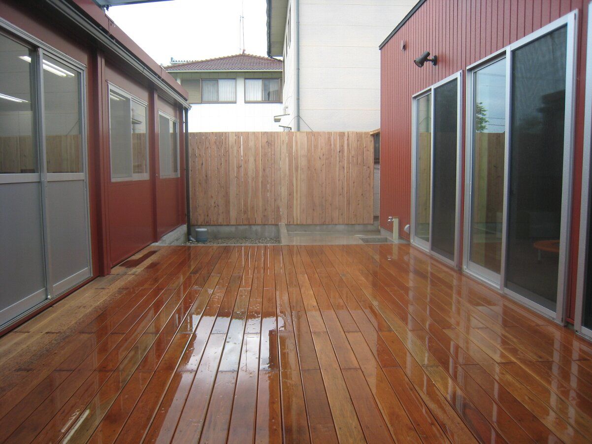 こどもたちの遊び場となる、中庭のウッドデッキが完成!