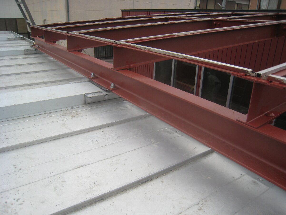 中庭にガラス屋根の骨組の鉄骨が取り付きました。