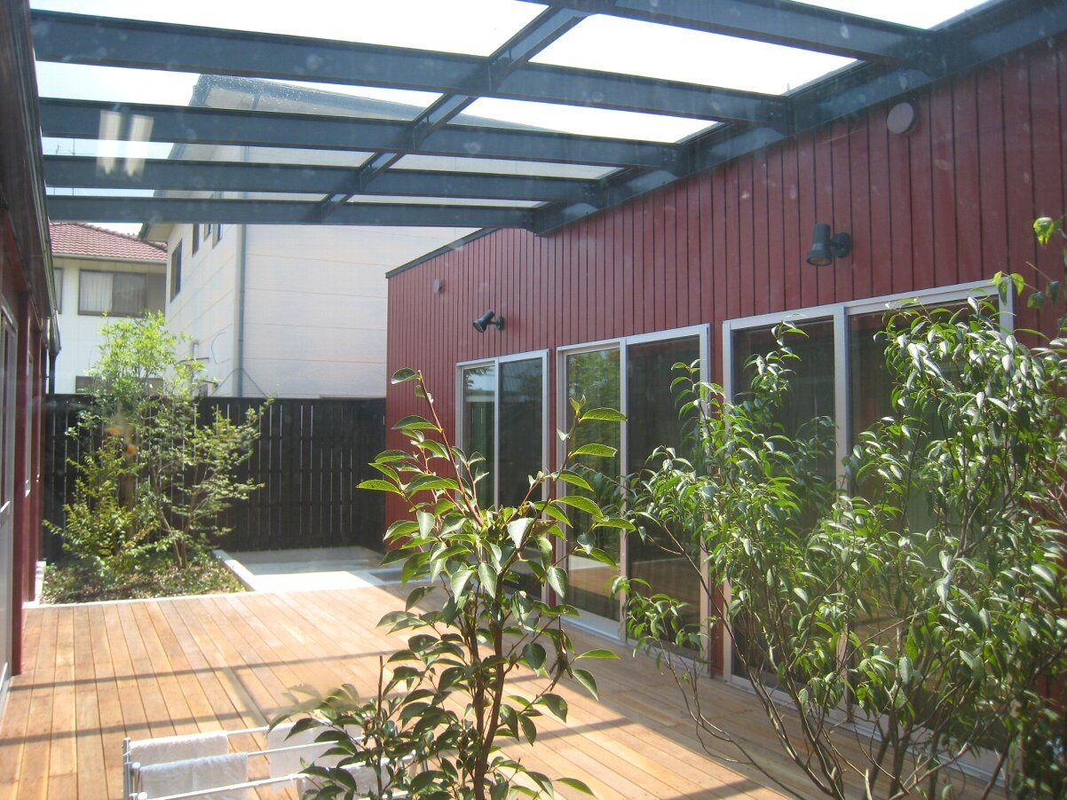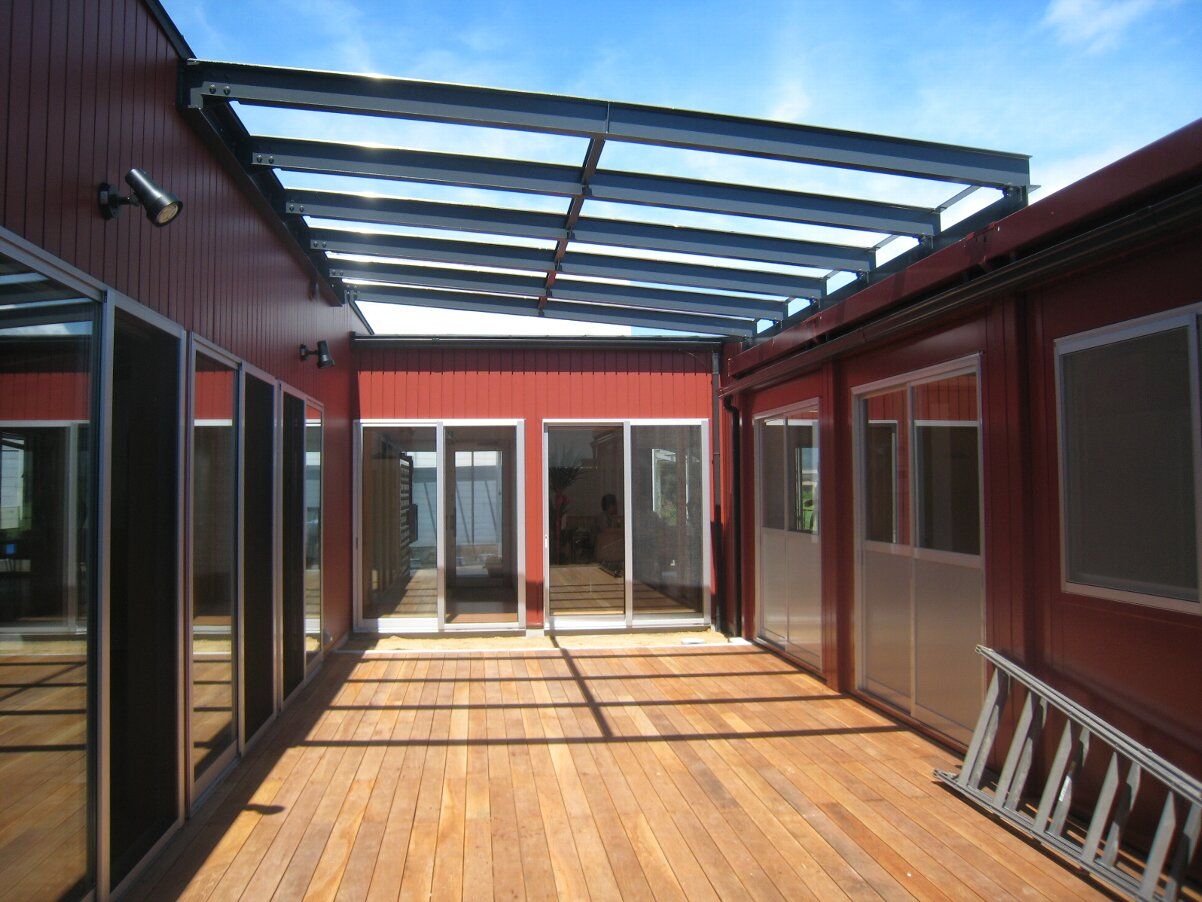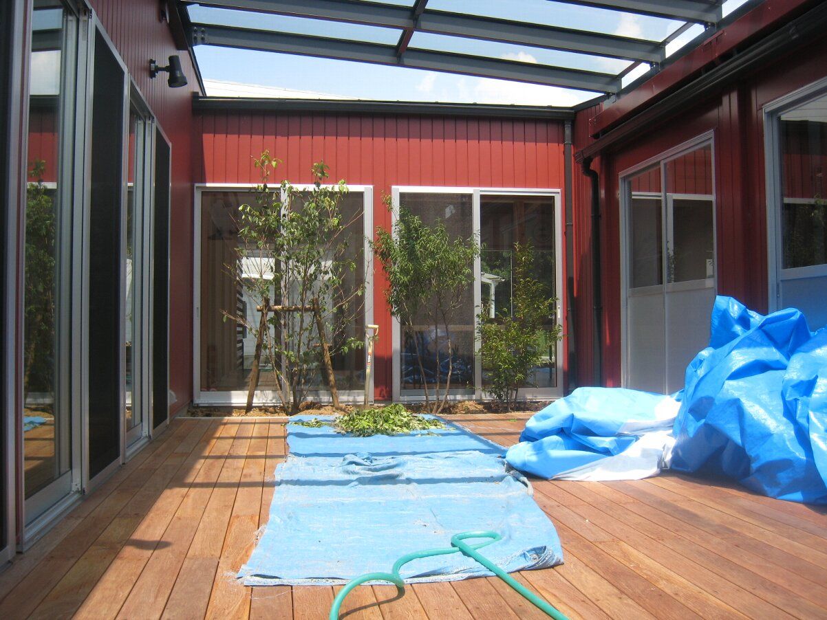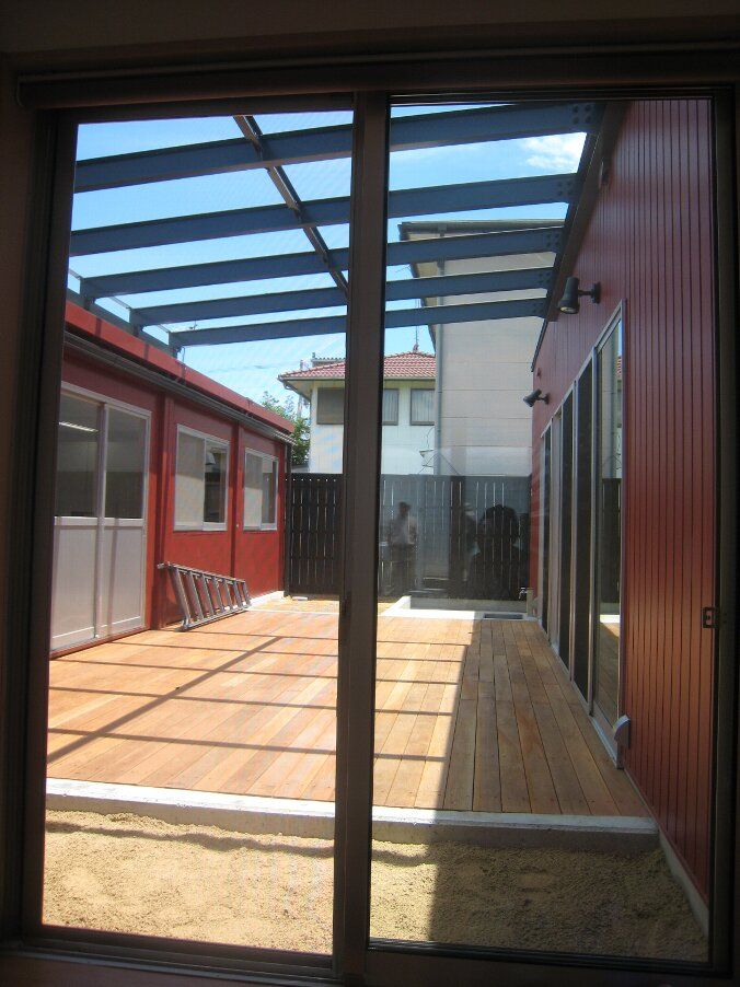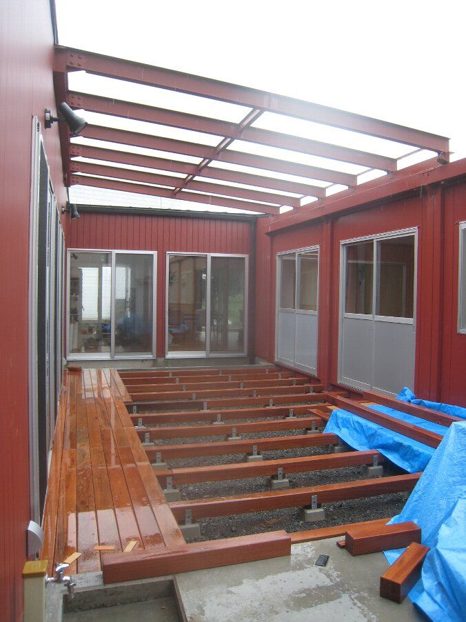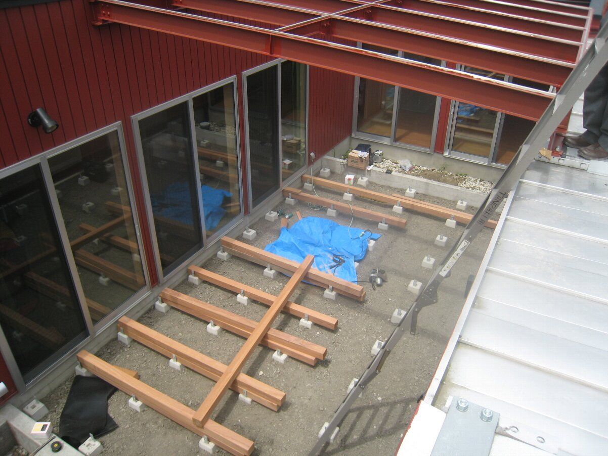 中庭ウッドデッキに架かる屋根のガラスは明日取付予定です。