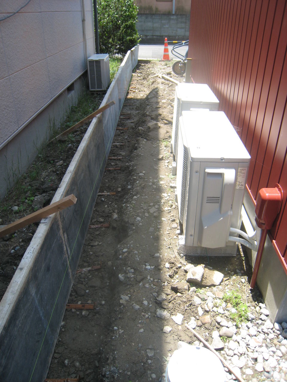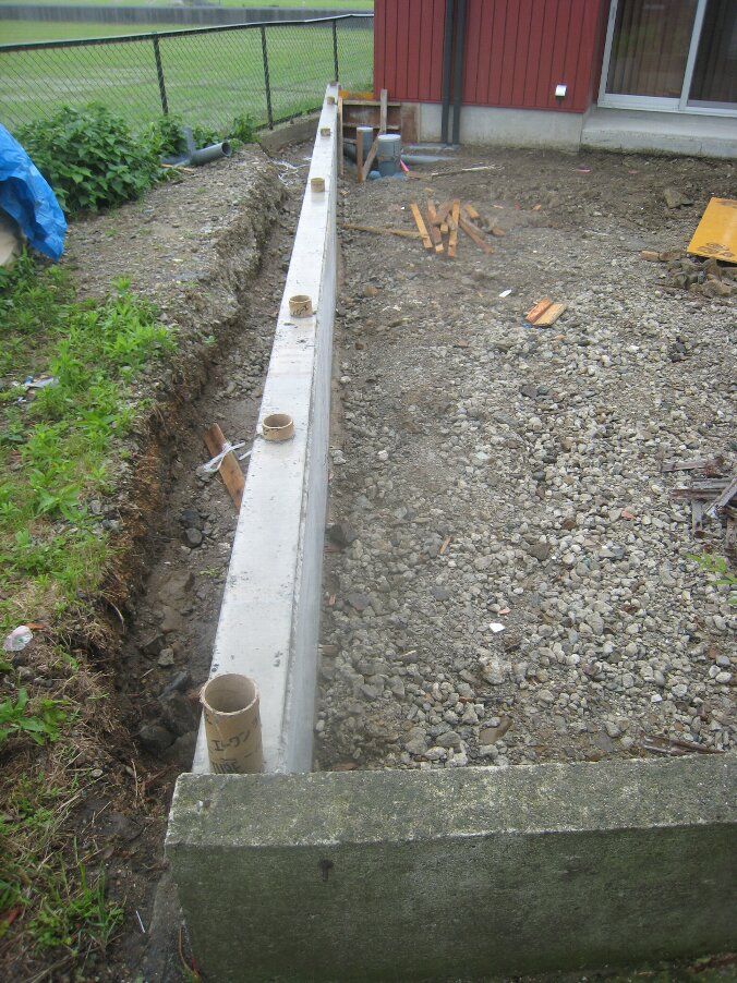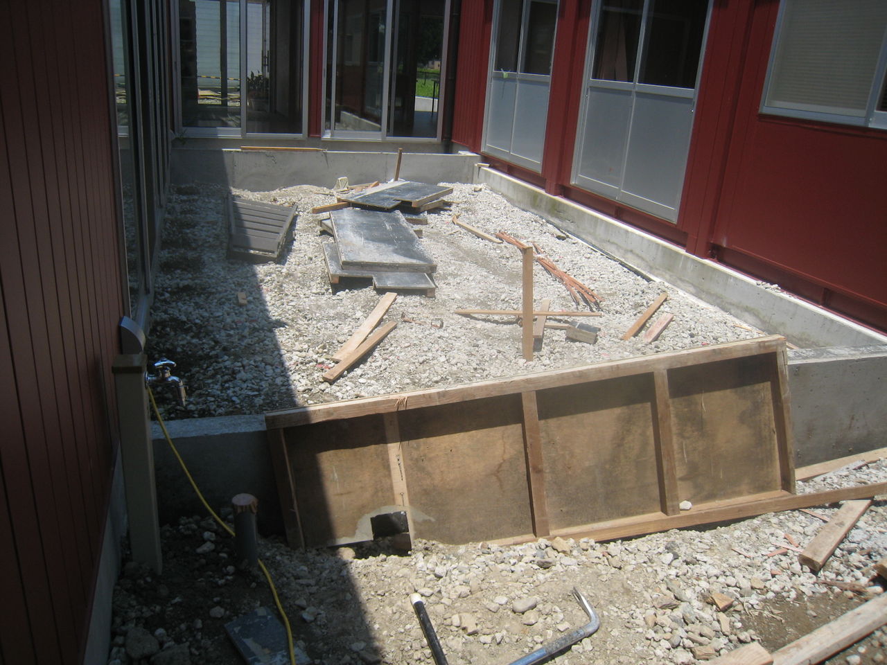 中庭のデッキ両脇のヒモコンのコンクリートが打てています。