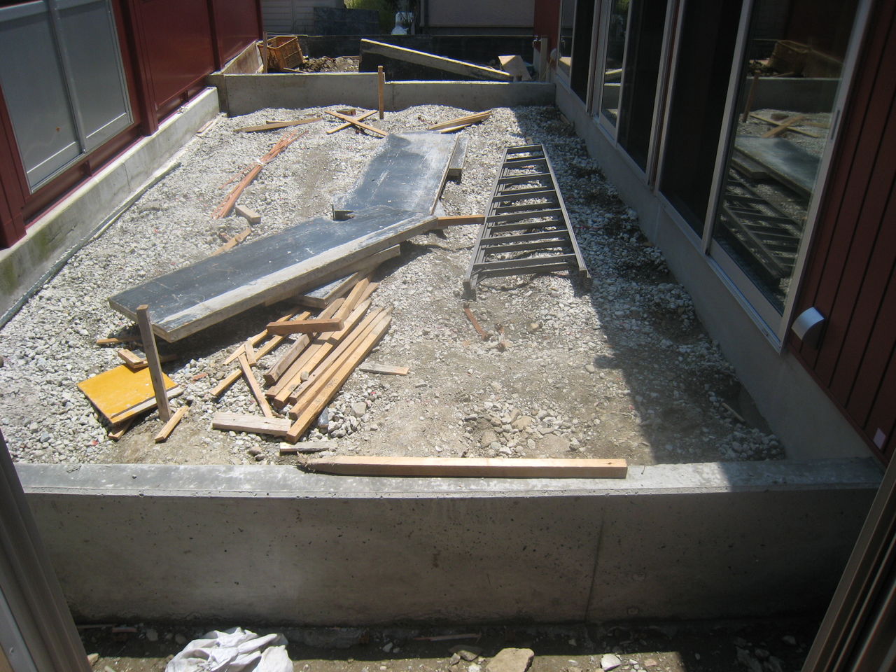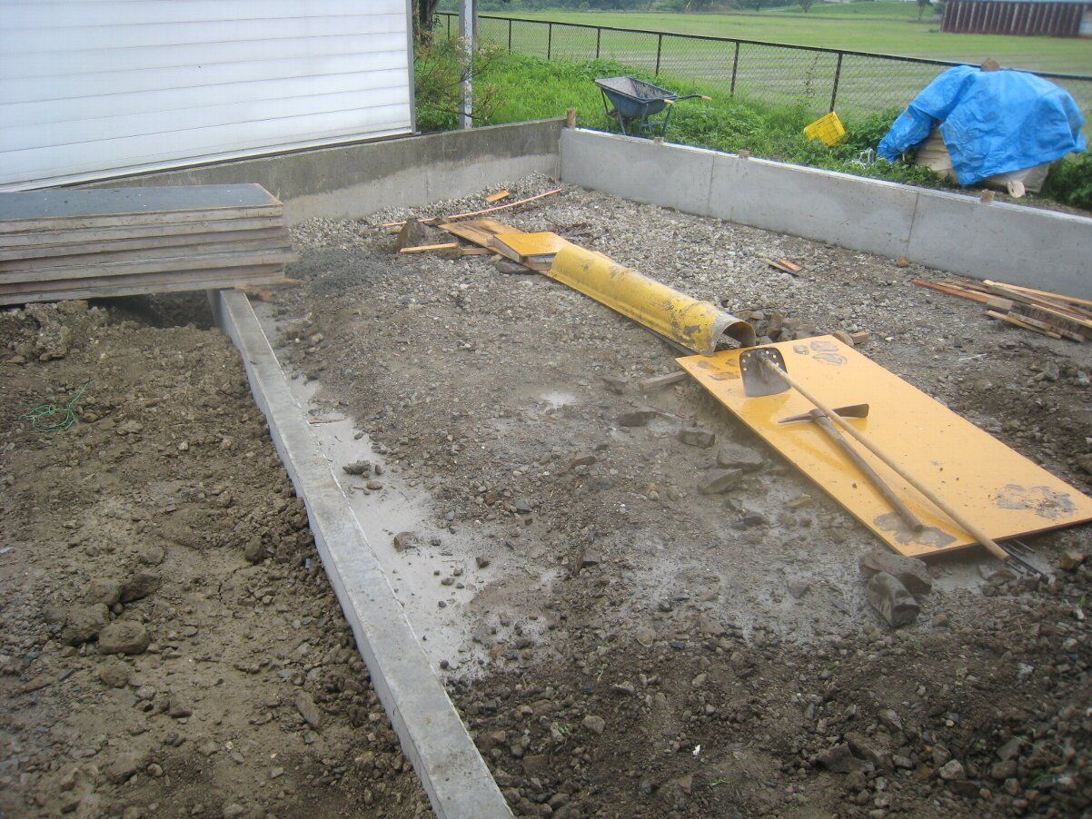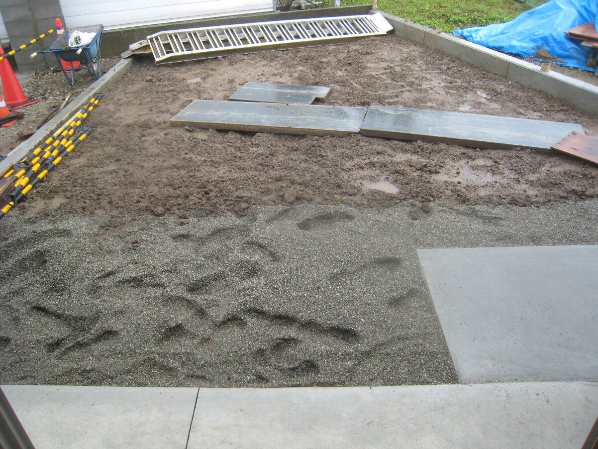 中庭のデッキ両脇のヒモコンのコンクリートが打てています。