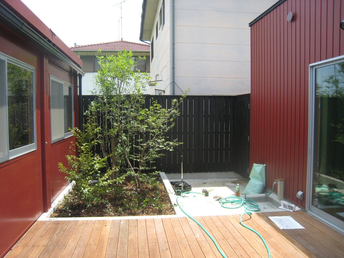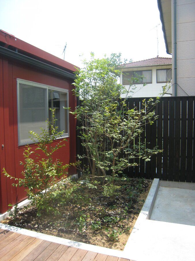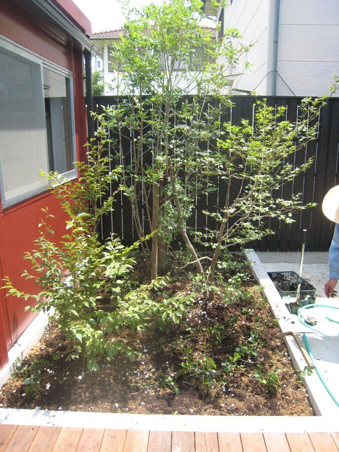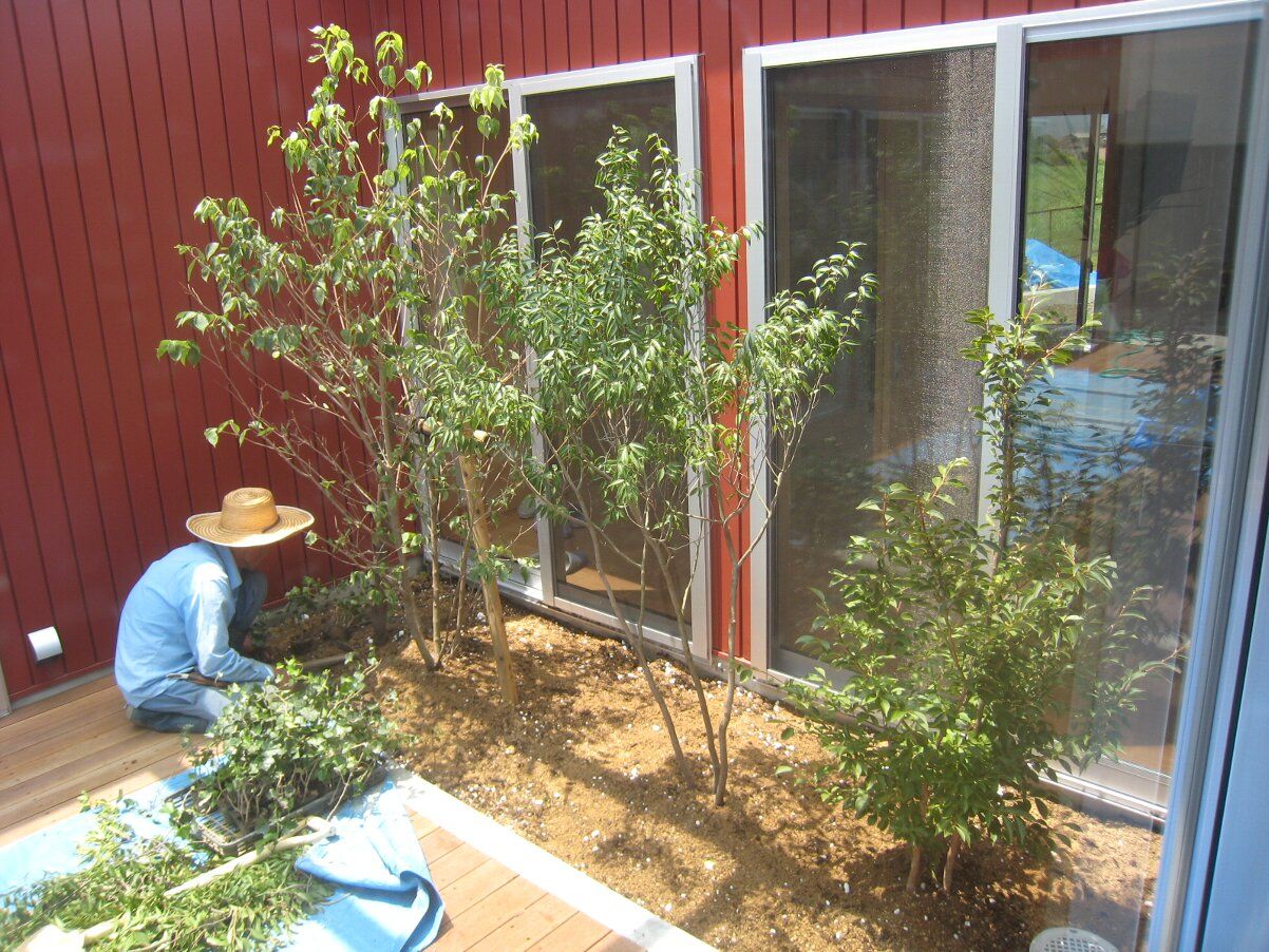 中庭の手前の窓際にはヤマボウシとハイノキとヒメシャラを植え、