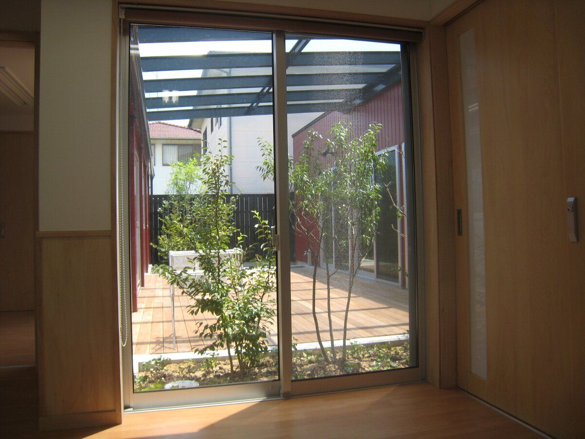 下の写真は玄関ホールからサッシ越しに中庭を見たところです。