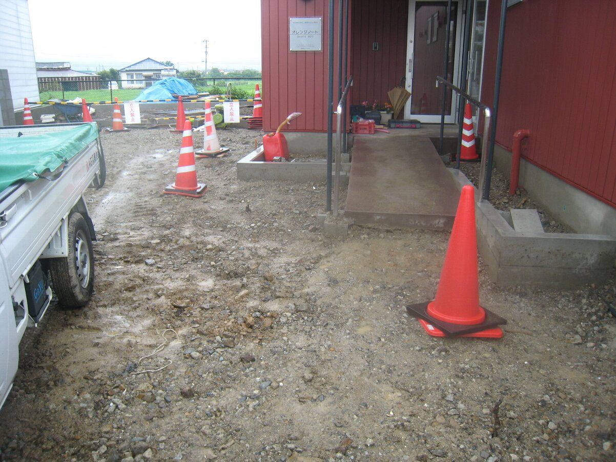明日からアスファルト舗装が始まるので、外部のマスの高さを調整しています。