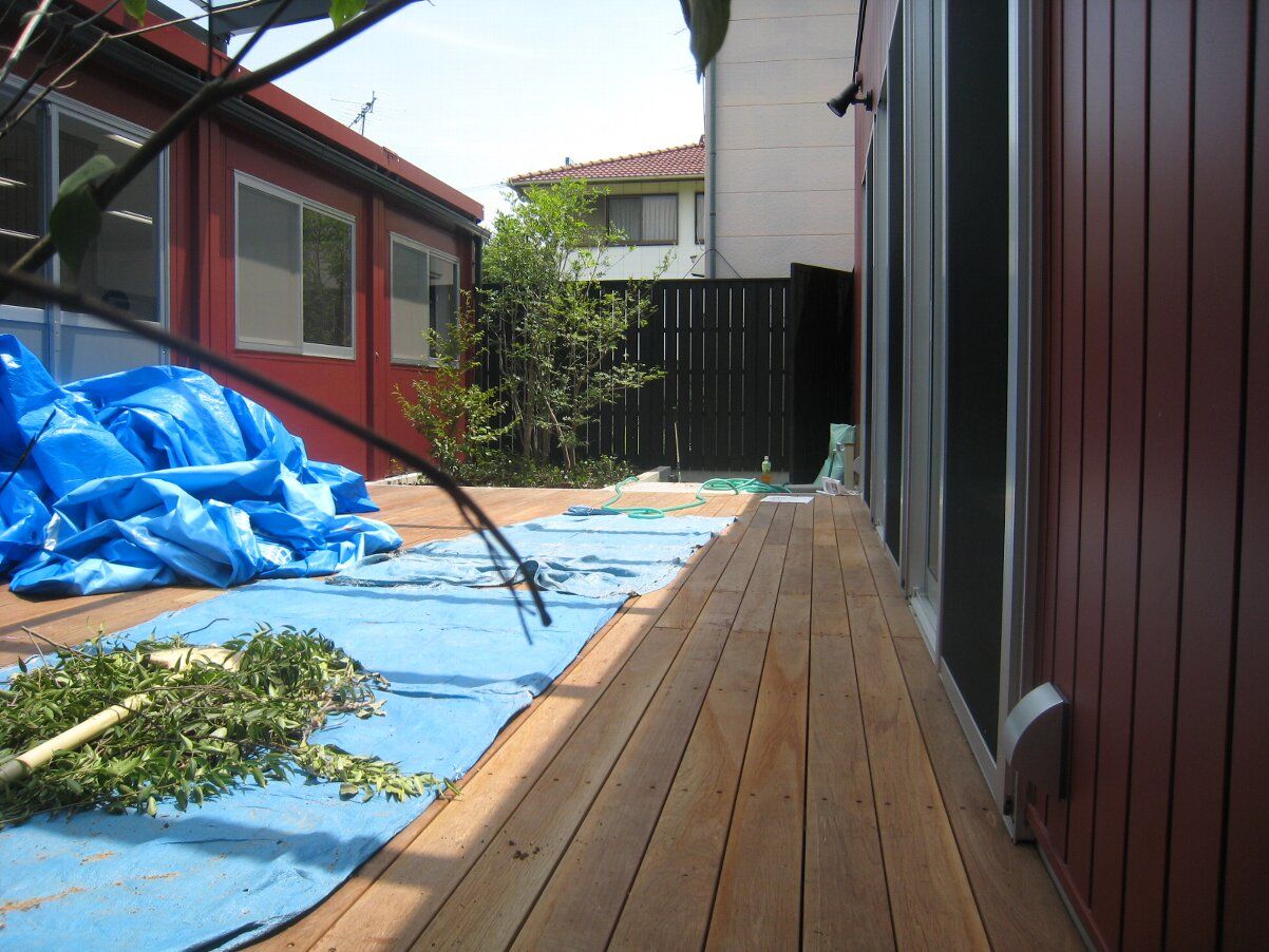 中庭のウッドデッキはここまで進んでいます。