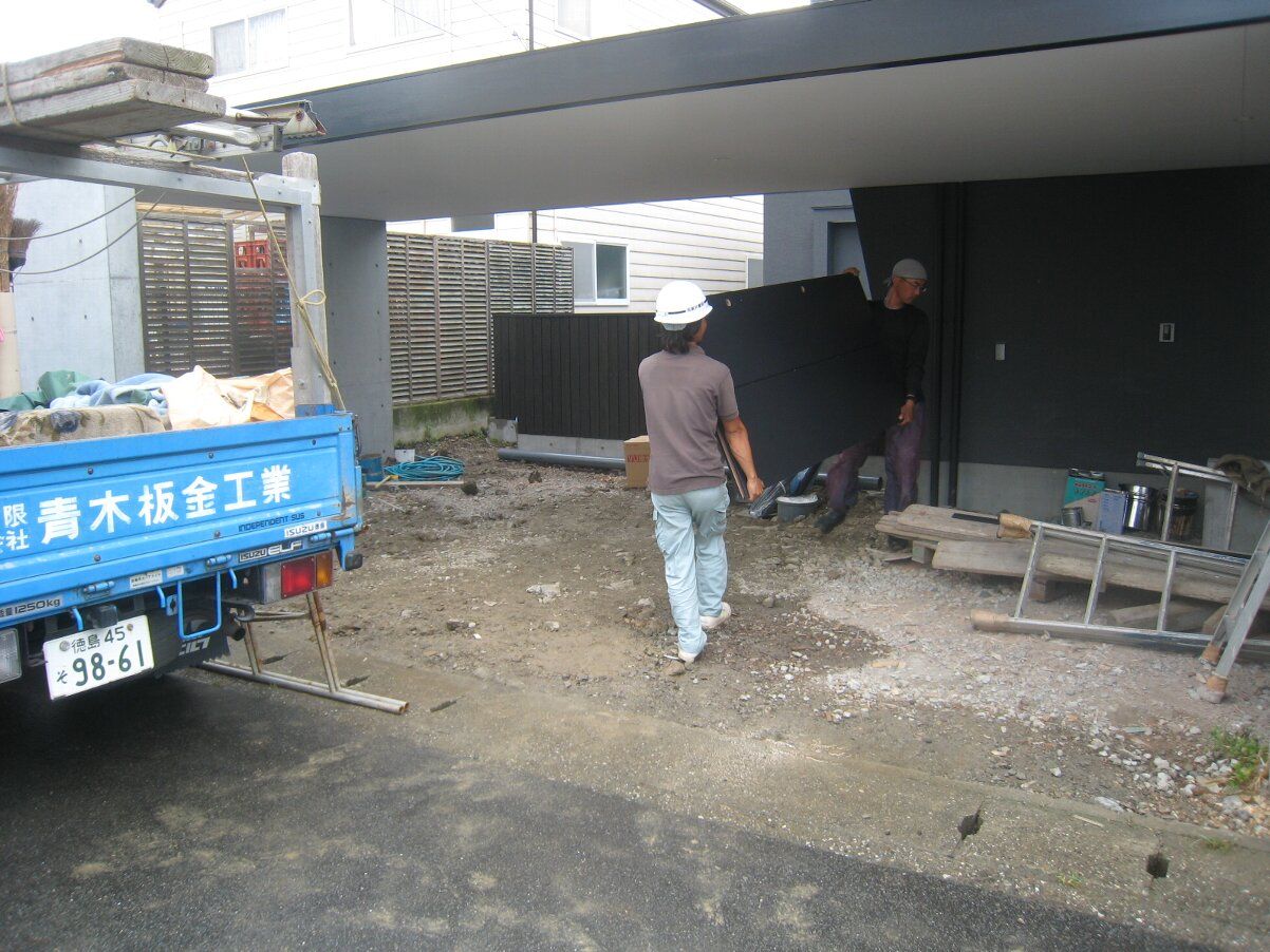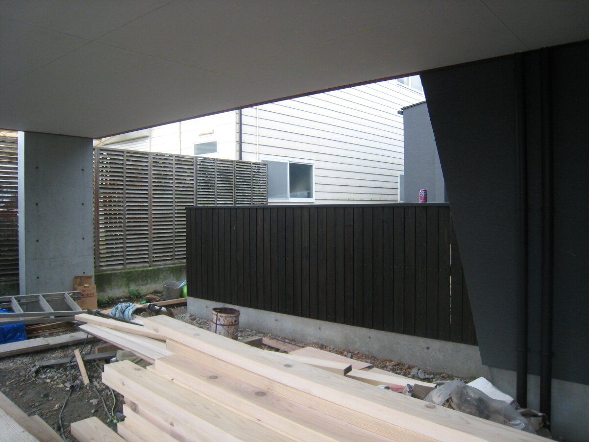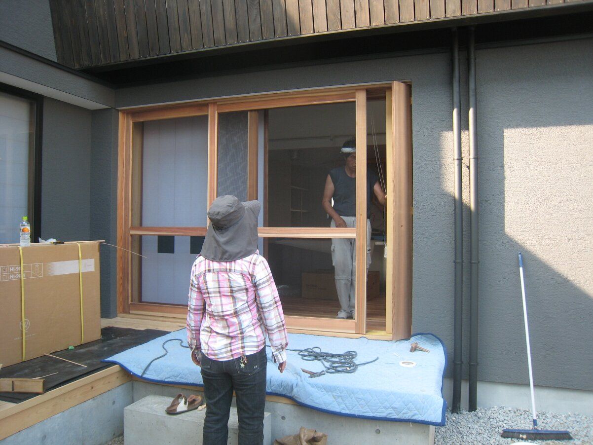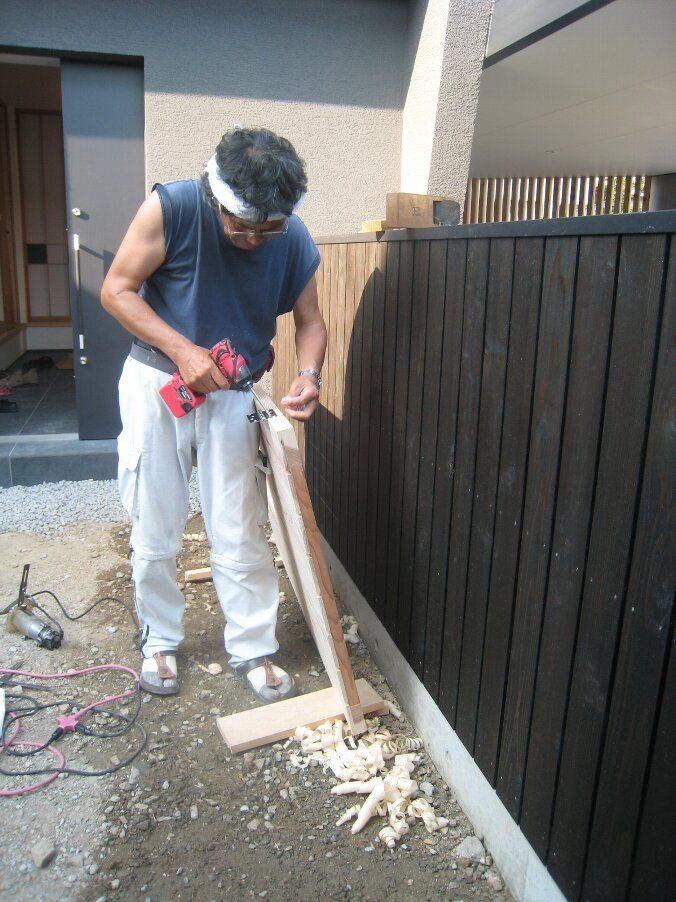 庭では建具吊込職人の杉本さんが板塀の扉、シメの仕事をしてくれています。