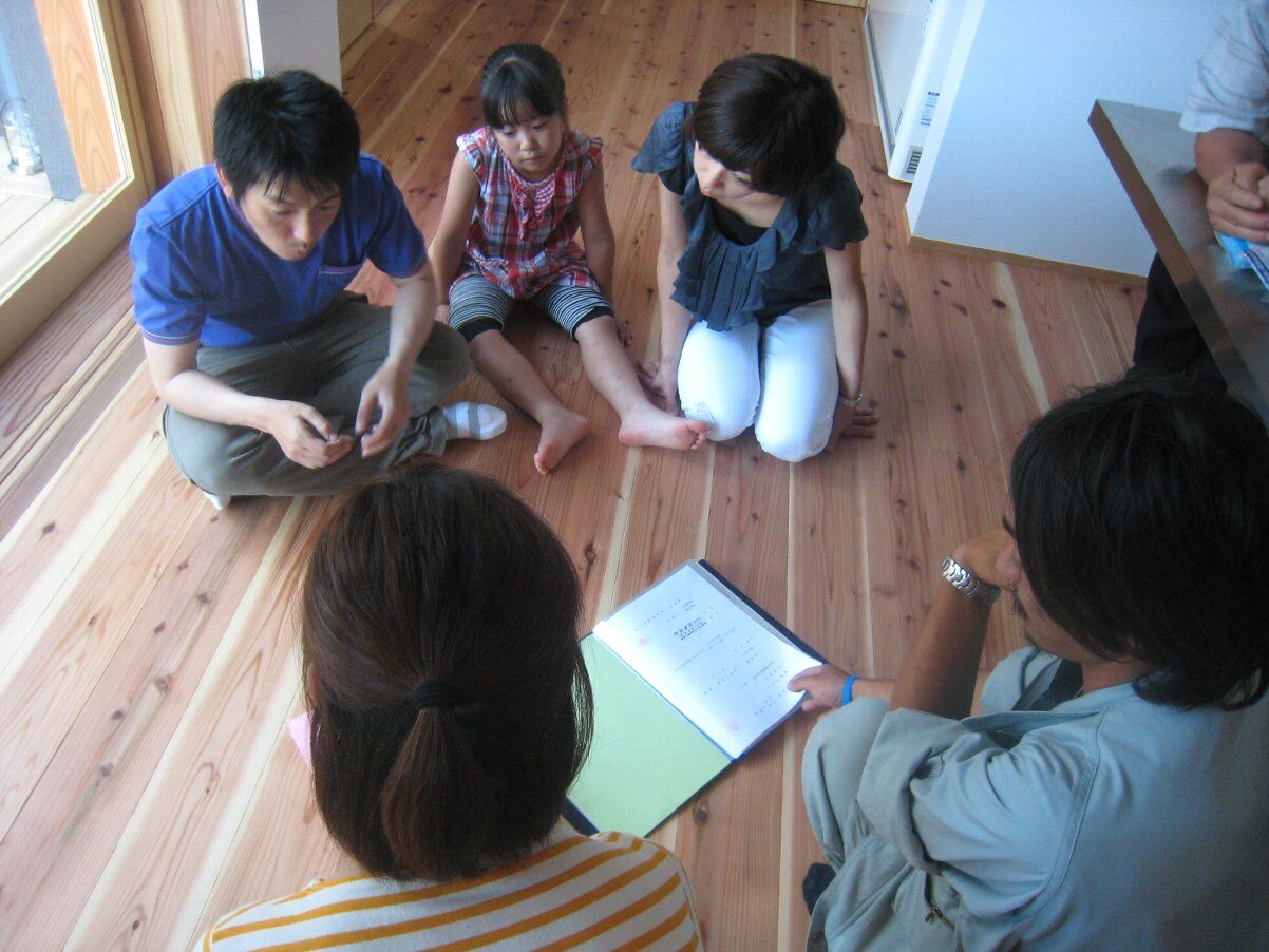 下では川口大工がサンドペーパーで手摺りの部材を磨いています。