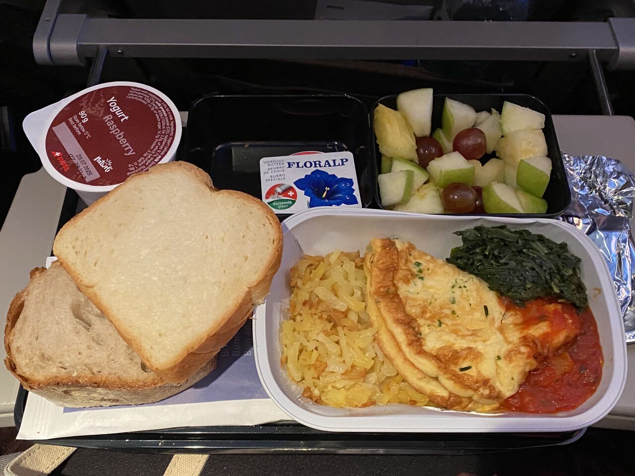 ほうれん草はどこか味がイマイチ。オムレツはどの航空会社の機内食で食べてもイマイチに感じます。