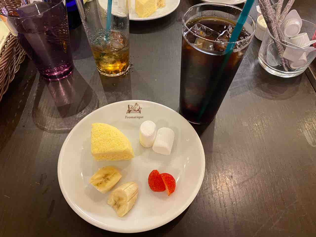 デザートはチーズケーキとチョコレートフォンデュ。あとアイスコーヒー。