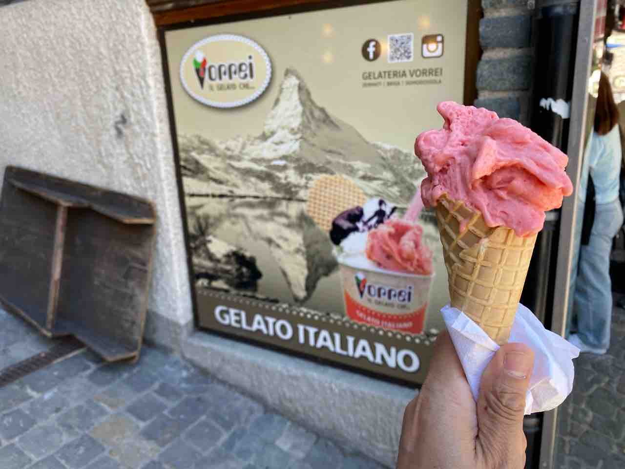 ツェルマットの街では最高気温が34度で暑くてジェラート食べちゃいました。