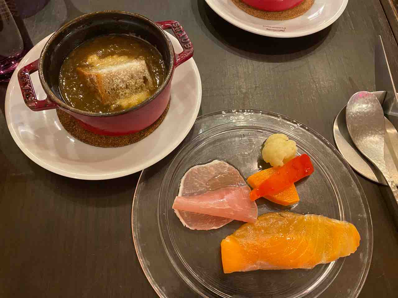前菜とオニオンスープ。