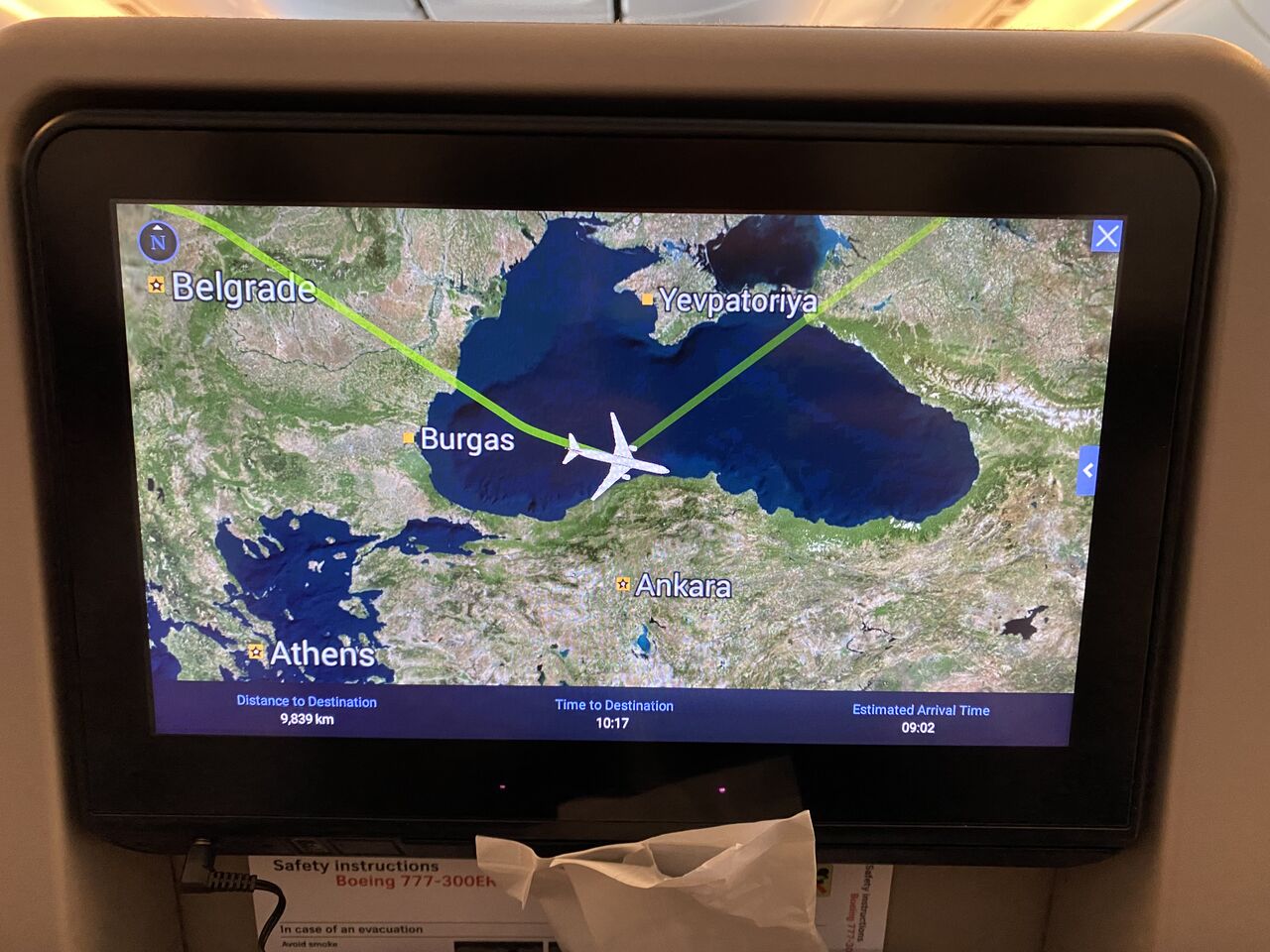 今回のフライト、ウクライナ問題でロシア上空を飛べないため、行きはアラスカやグリーンランド上空を通る北回りルートでしたが、帰りはトルコや中央アジア、中国を通る南回りのルート。行きと帰りで違うルートでした。