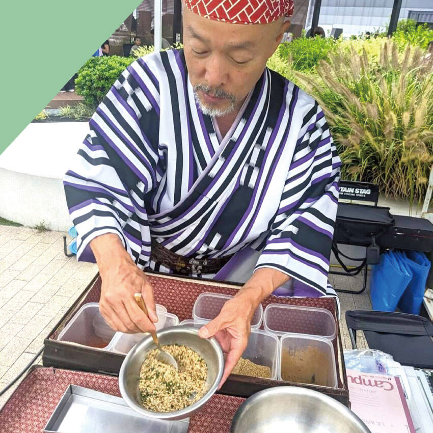 行田でとれた食材を使った郷土料理の呉汁や、古代米ともち麦の在来青大豆おにぎりをお持ちします。ぜひひと休みに寄って下さい!