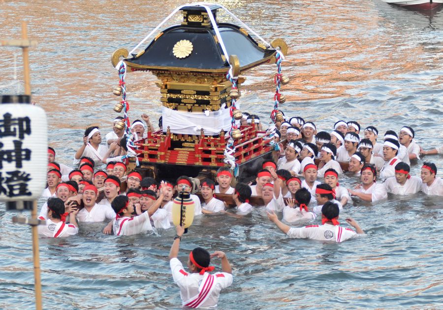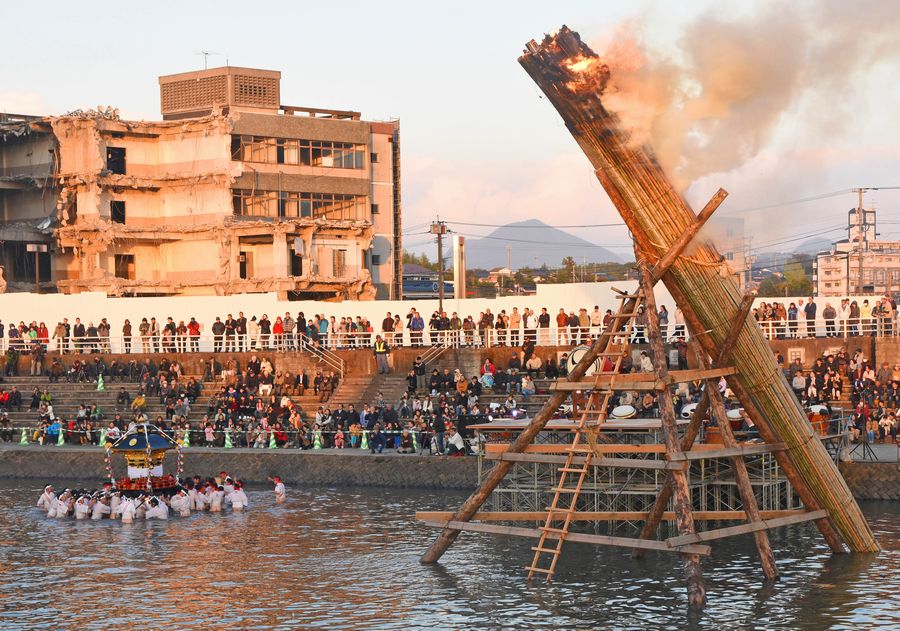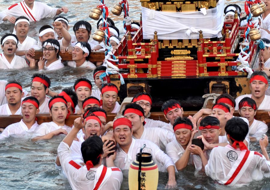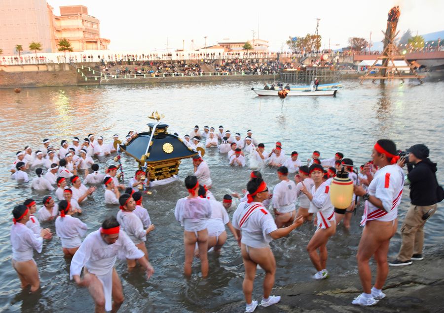 約1トンのみこしは陸組の男衆にかつがれ神社を出発、途中で締め込み姿の川組に渡され、商店街など練り歩いた後、市中心部を流れる桂川に設置された長さ16メートルの大たいまつに、橋の上から火矢が放され点火。みこしは川の中に入り水しぶきを上げると大勢の見物客が歓声をあげました(写真)