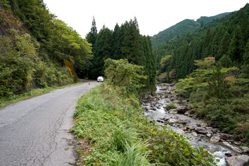 南東方向に川沿い道で上流へと遡り、