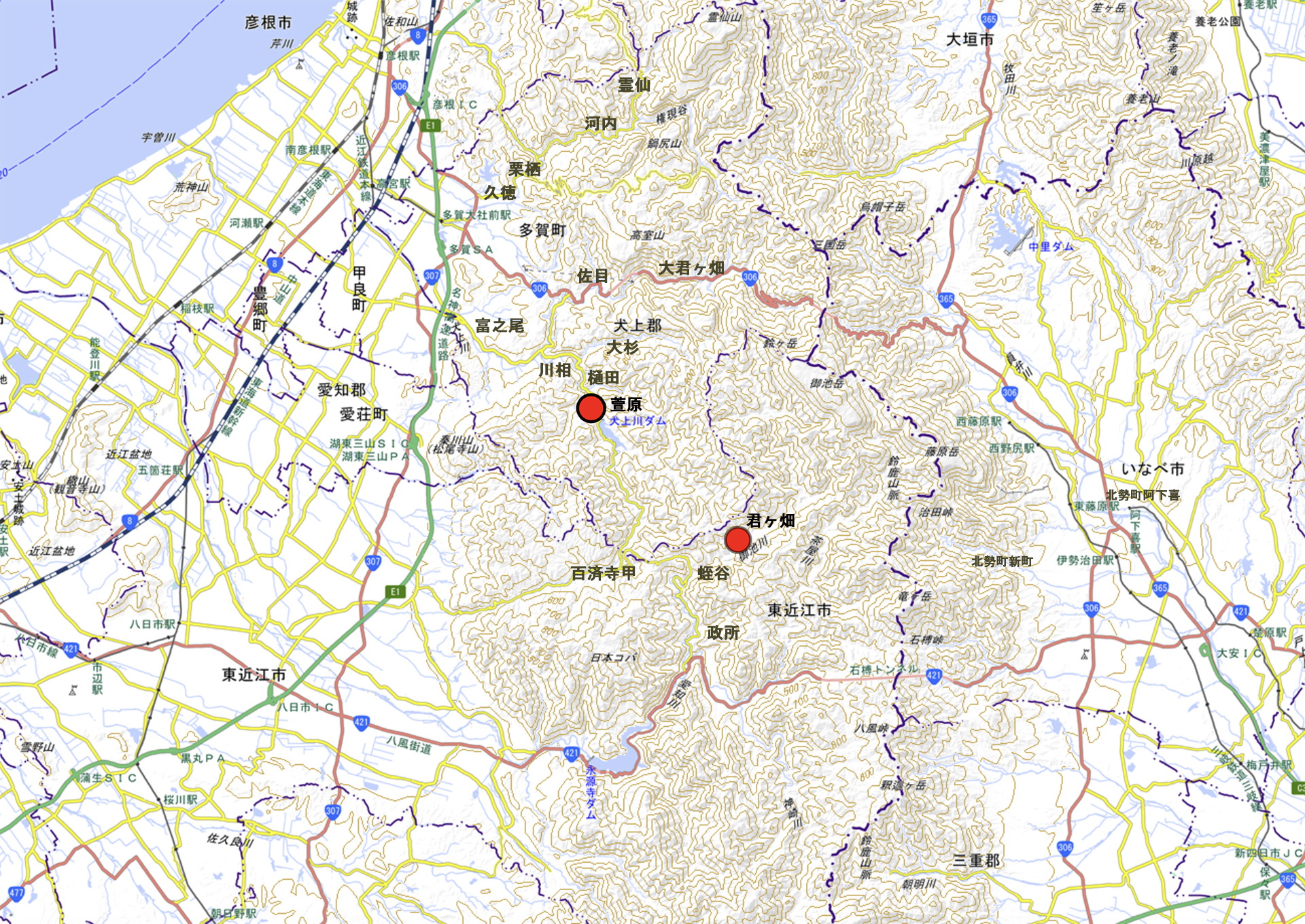 赤丸が「萱原」と「君ヶ畑」の2つの集落です。