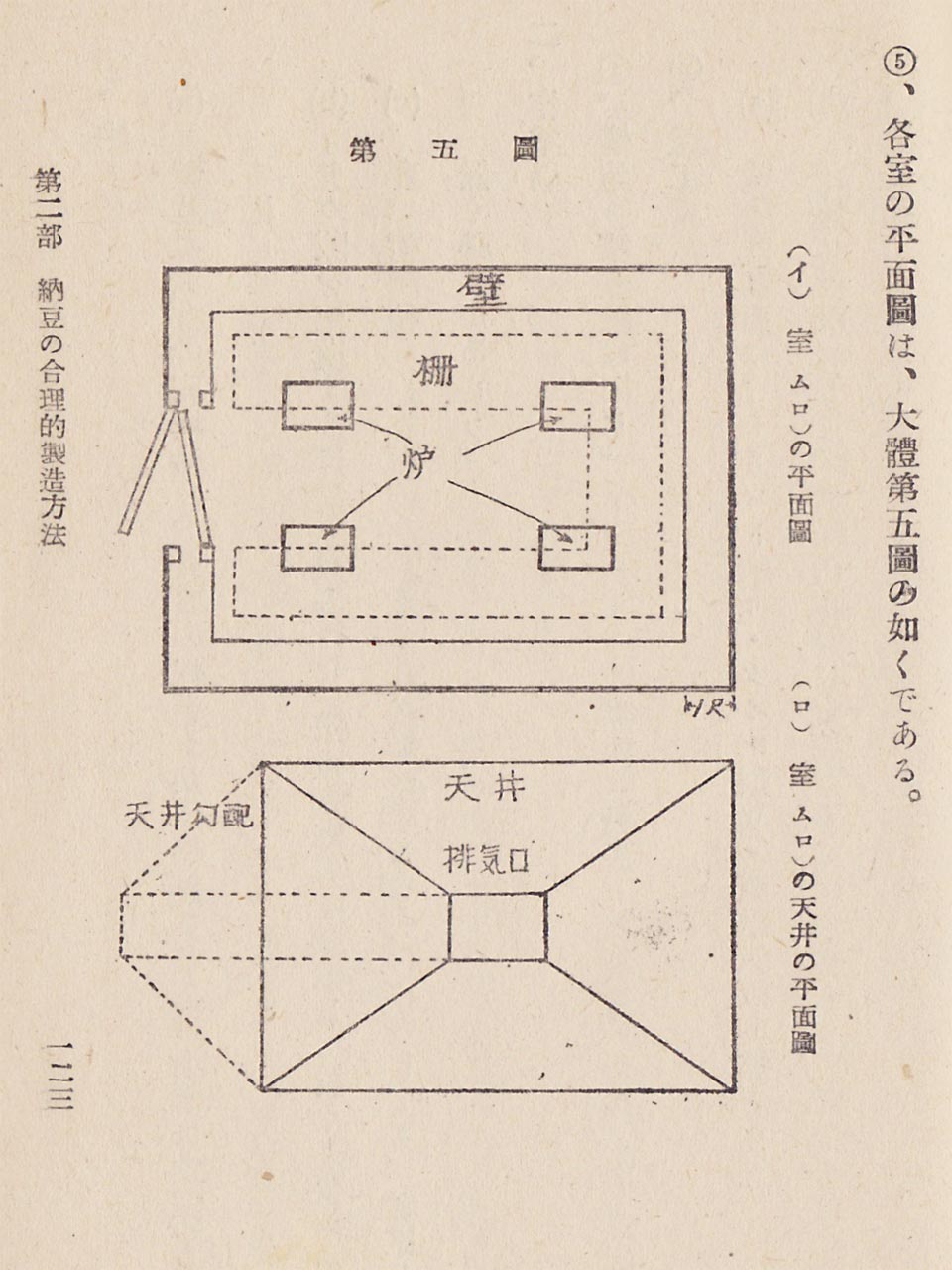 ・図版は三浦二郎氏執筆の「合理的納豆製造法」に記載されている文化室の図面です。