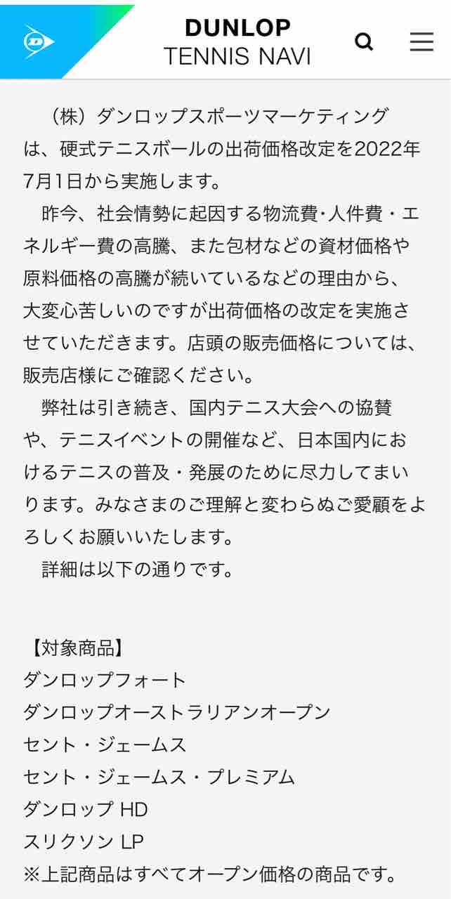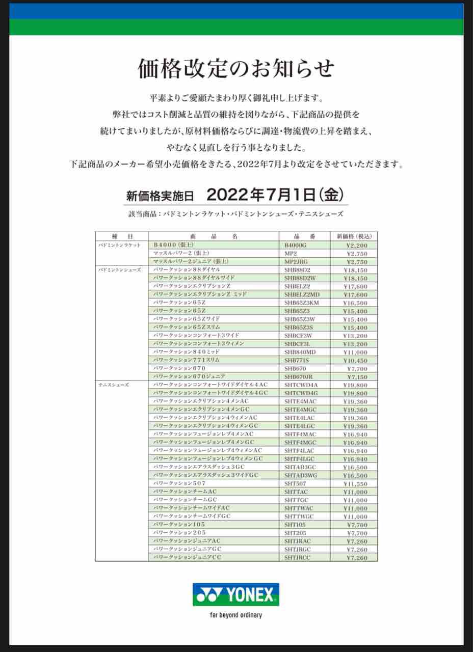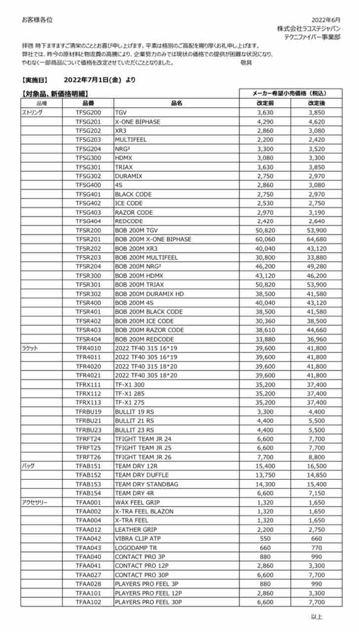 テニス業界も7/1から値上げラッシュとなります。
