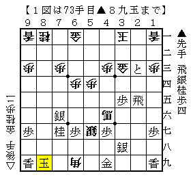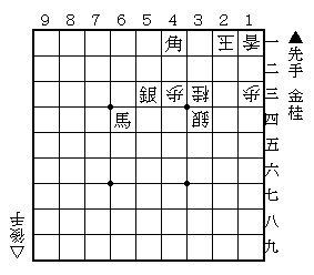 上の図は、実戦に現れた局面を基にした詰将棋です。 答えを白文字で記入しました。 答え ⇒ ▲3一金△同玉▲4二銀成△2一玉▲3二角成△1二玉▲2四桂までの7手詰 基になったのは第41回将棋日本シリーズ、広瀬章人八段対高見泰地七段戦の投了1手前の局面(1図)です。 なお、1図の前に先手玉は7八にいたのですが△6九角に▲8九玉と逃げて頓死してしまいました。 ▲8八玉と逃げていれば不詰みとのことでした。将棋ランキングにほんブログ村