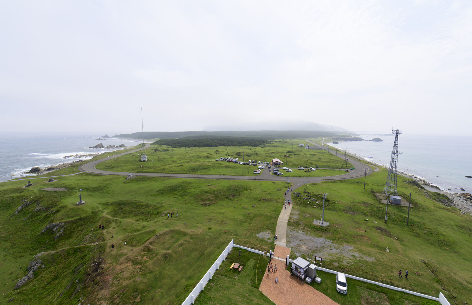 高所恐怖症の私が、灯台の上から決死の覚悟で撮った写真です。私は同じ構図で3~4枚しか撮れませんでした。右側の道路(津軽海峡)から灯台に来て、このあと左側の道路(太平洋)を南下します。