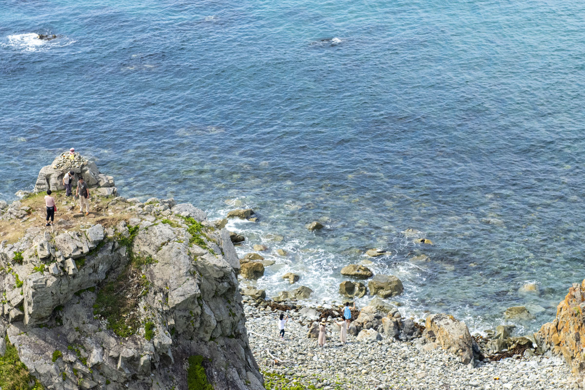 妻が灯台の上から撮った、津軽海峡側の海岸です。多くのの観光客が来ていました。