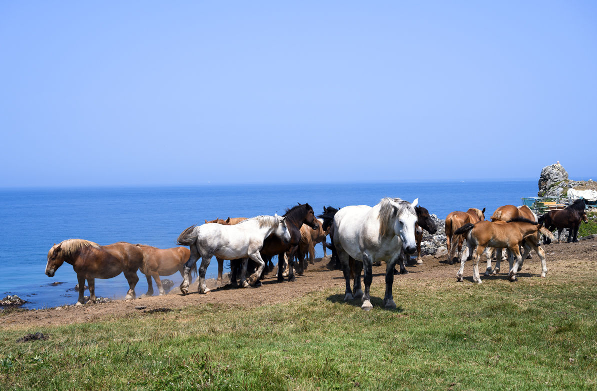 尻屋漁港⑥から逆戻りして、最初に入場した②⑦のゲート手前に来ました。沢山の車が並んでいるので何かなと思ったら、今日はゲート付近に寒立馬が集まっていたのです。