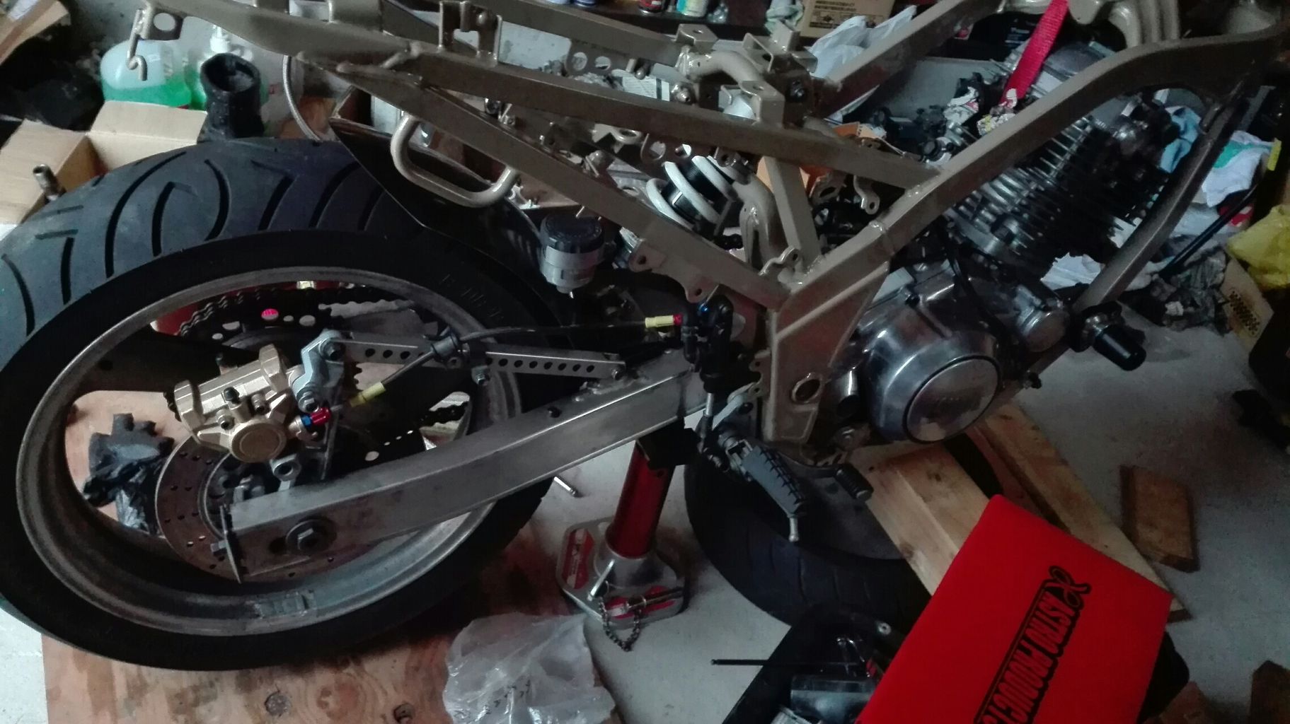 エンジン、スイングアーム、リアショックは取り付け、その他は仮組です。