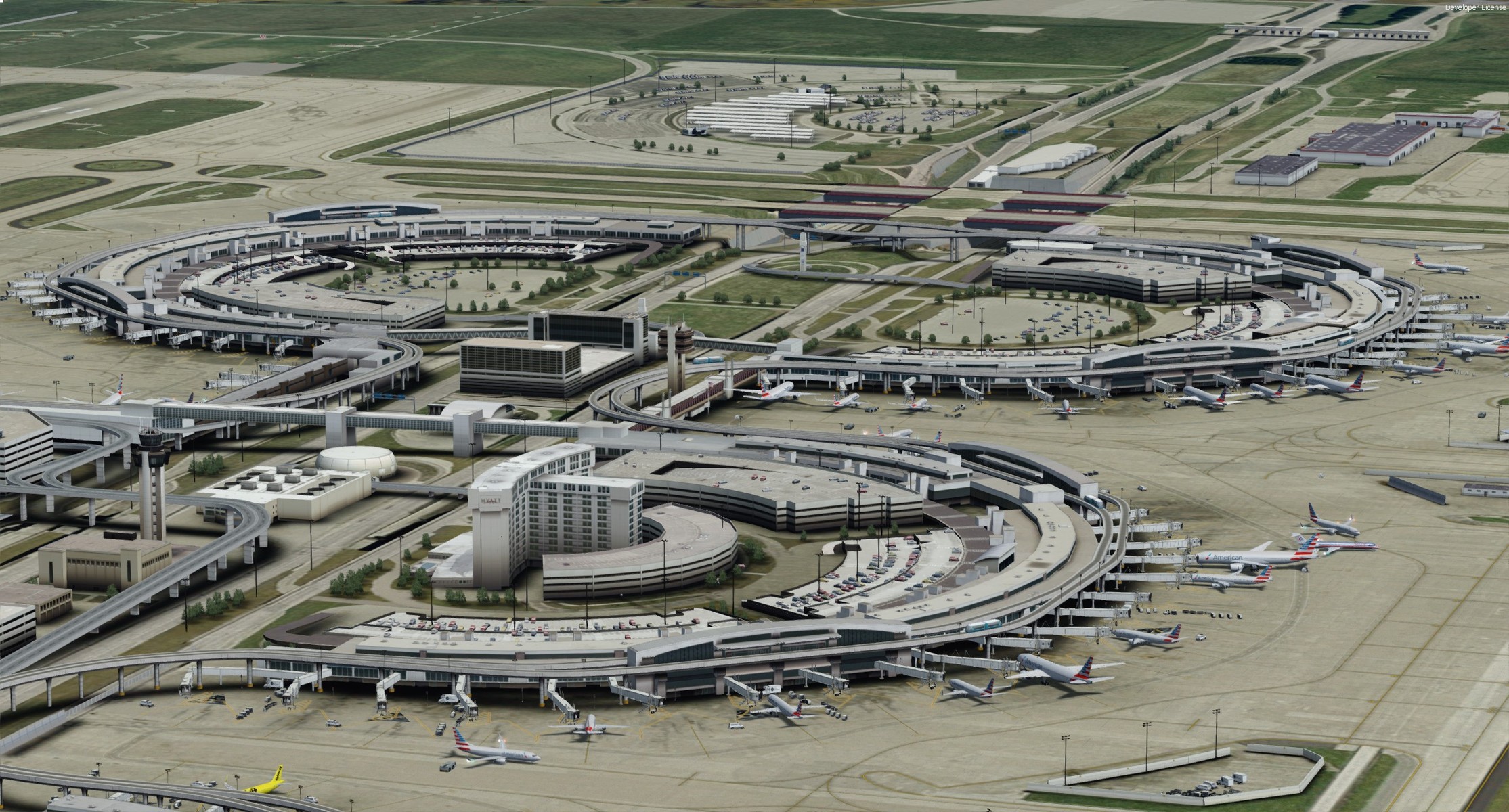 総発着数では世界3番目、旅客運送では6番目の空港です。敷地面積はマンハッタン島より大きくて、テキサス州最大、アメリカ全土でもデンバーに次ぐ広さです。発着枠の7割が世界最大手のアメリカン航空で、もちろんアメリカンのハブ空港です。「フォートレス・ハブ」と呼ばれています。