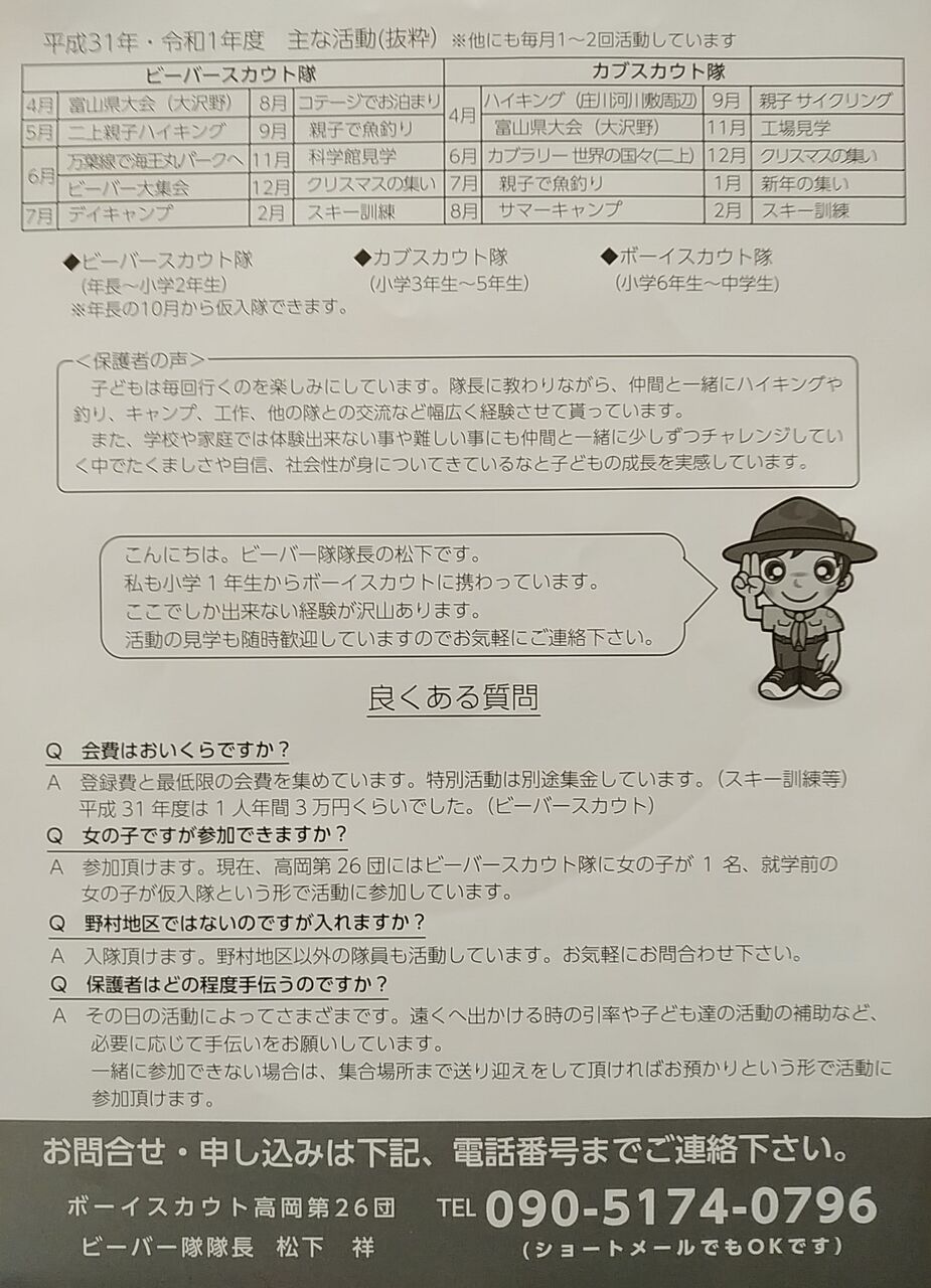 富山県高岡市で活動するボーイスカウトの団体です。 活動の内容を綴っています。ボーイスカウトに興味のある方は是非読んで欲しいです。
