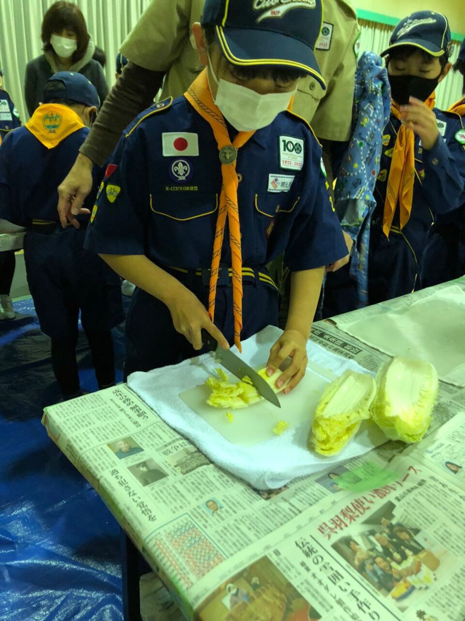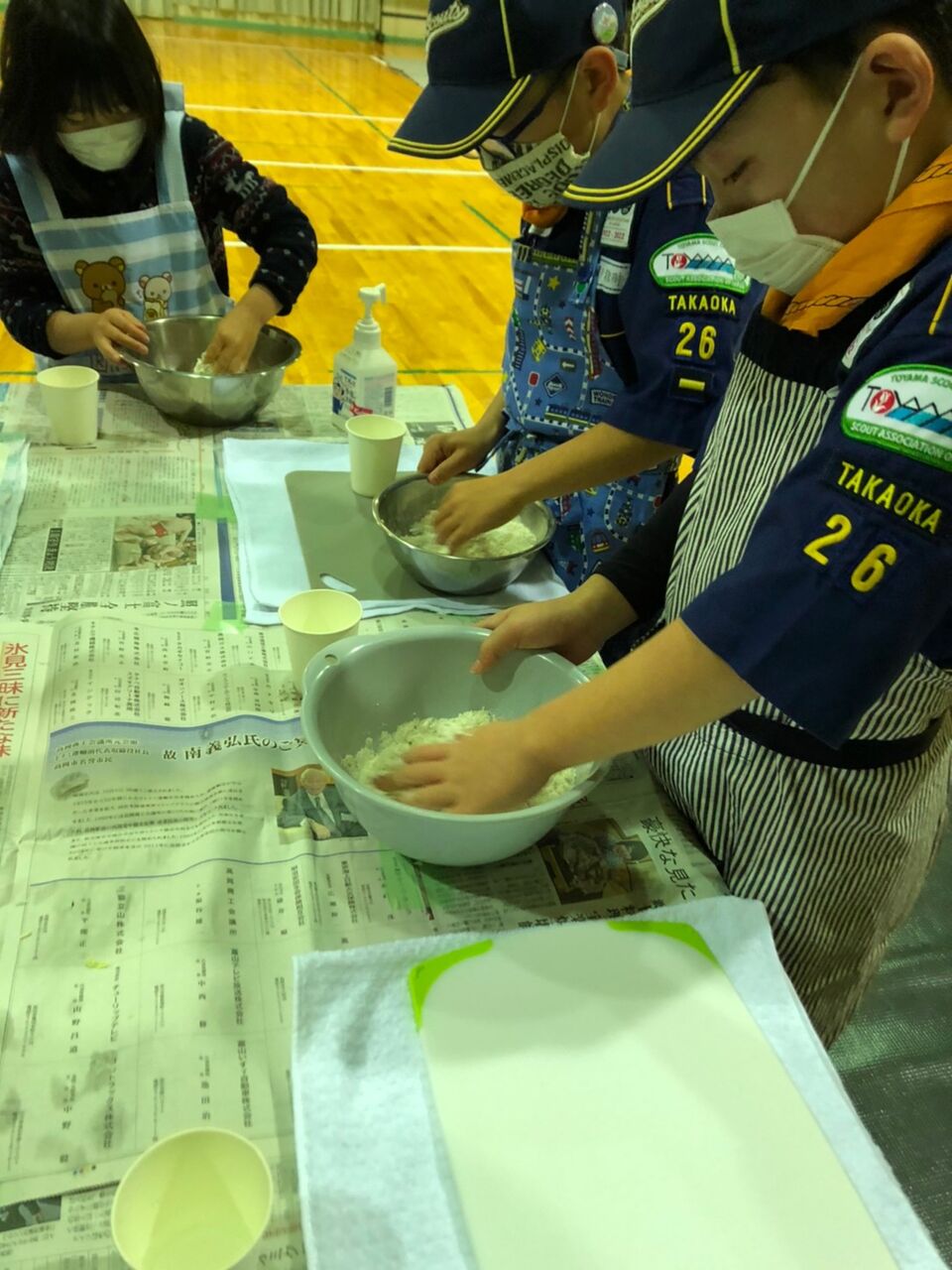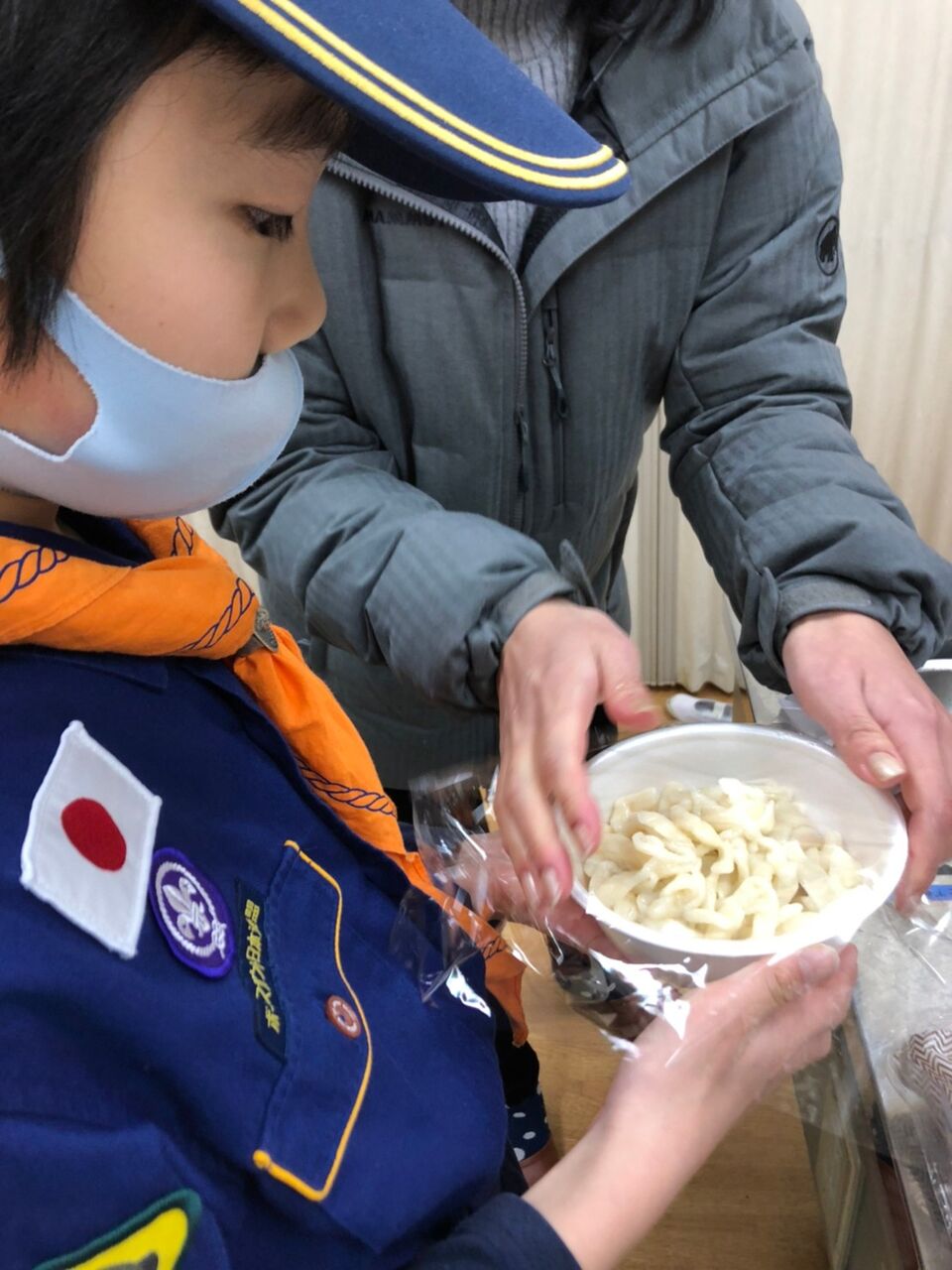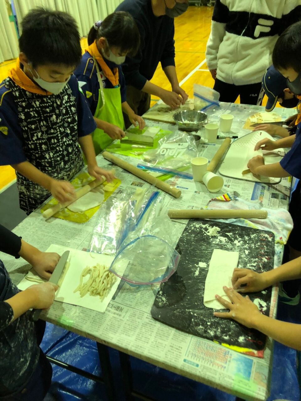 その後はうどん作りです。小麦粉に塩水を混ぜて生地がまとまるまでしっかりこねます。初めは手に沢山生地がついて苦戦していたスカウト達ですが、だんだんコツをつかんで次第にきれいに丸めていました。その後、打ち粉をして薄く伸ばして包丁でカットし、鍋でゆでました。ゆでる際に結構麺が膨らんだので、ボリューム感ある仕上がりになったスカウトも。味見をしながらゆで具合を確認して、水で締めた後鍋の具材をかけて完成です。麺から作るうどんは食べ応えがあって、粉だらけになりながらも、がんばったかいがありました。寒い日でしたが、身体もポカポカ温まりましたね。