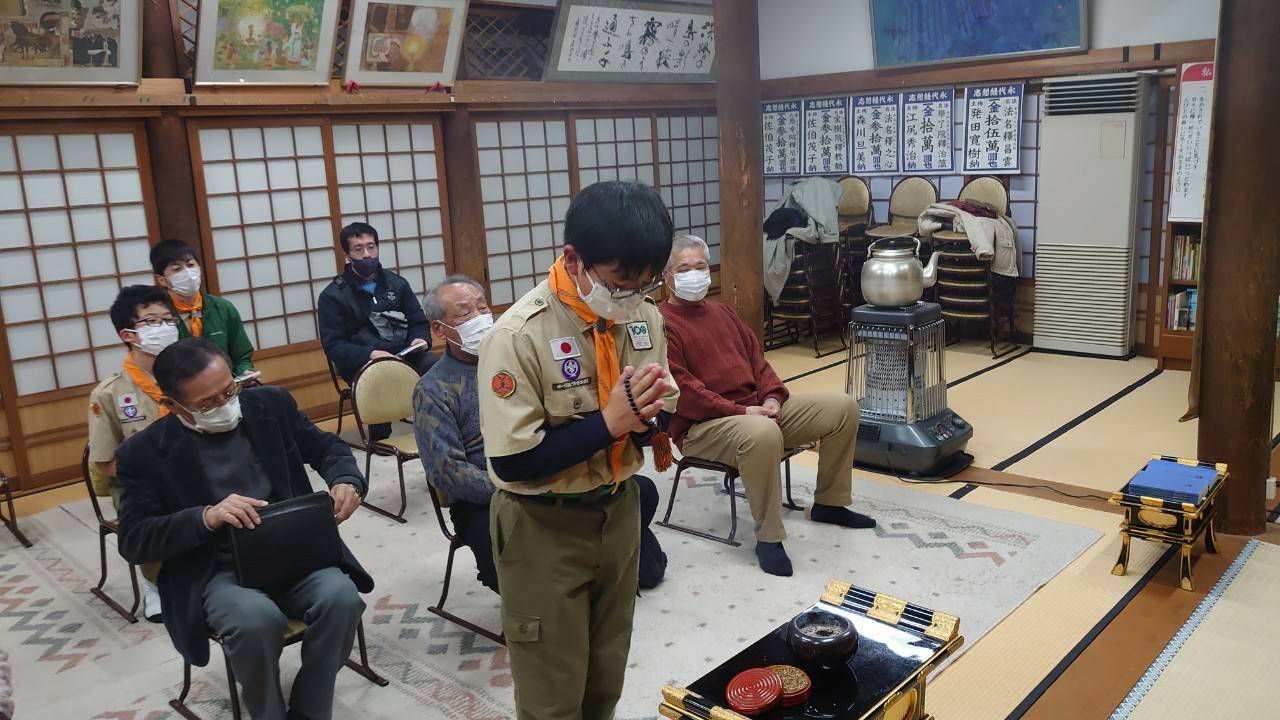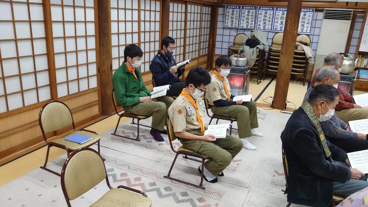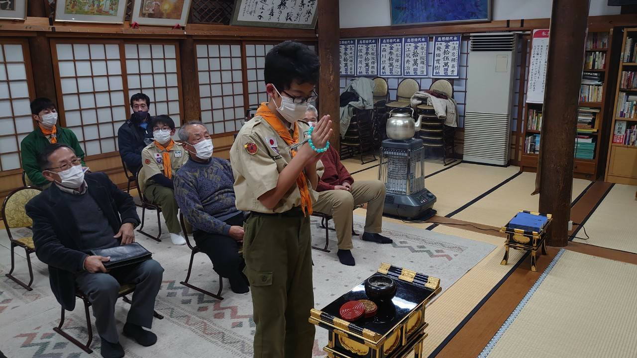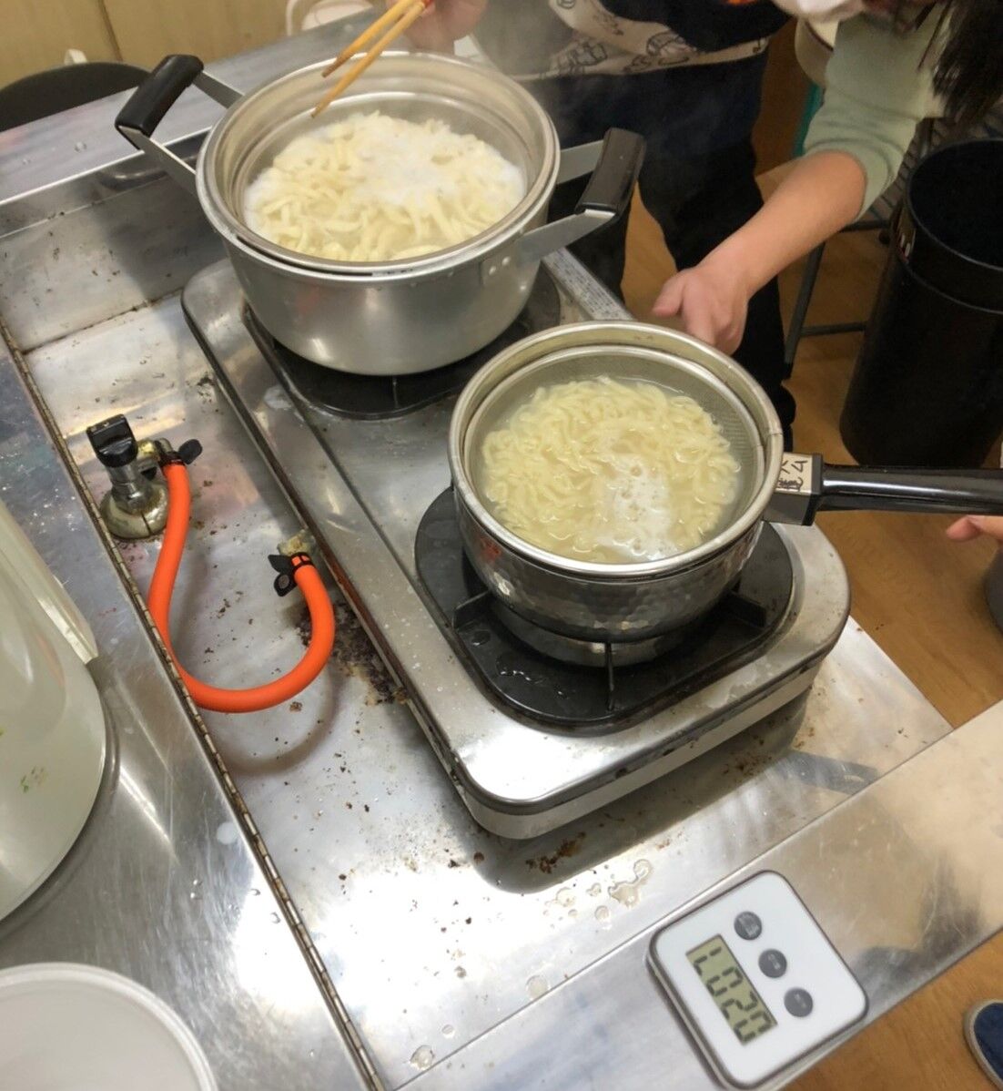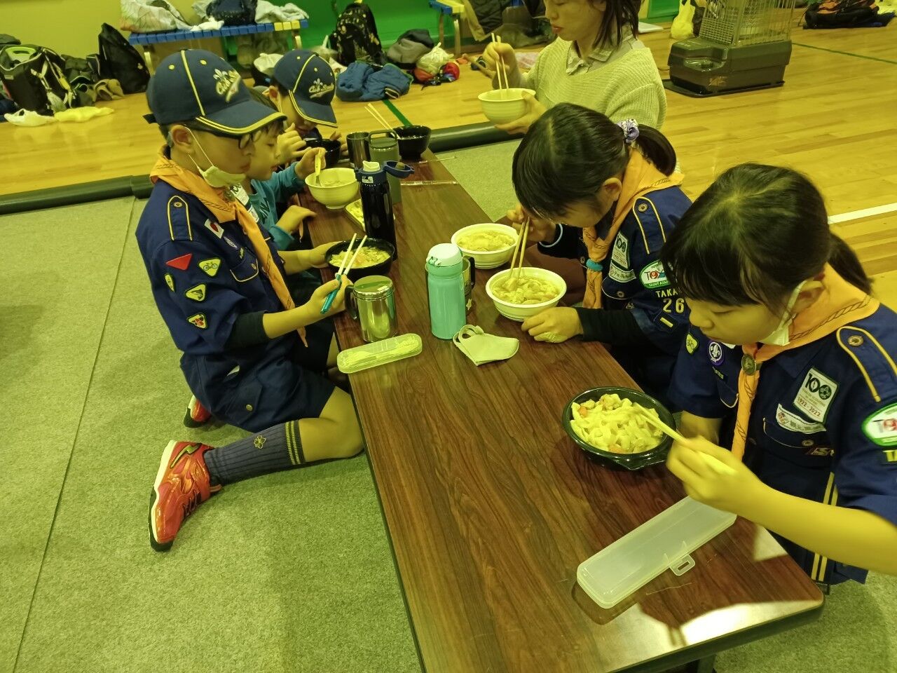 その後はうどん作りです。小麦粉に塩水を混ぜて生地がまとまるまでしっかりこねます。初めは手に沢山生地がついて苦戦していたスカウト達ですが、だんだんコツをつかんで次第にきれいに丸めていました。その後、打ち粉をして薄く伸ばして包丁でカットし、鍋でゆでました。ゆでる際に結構麺が膨らんだので、ボリューム感ある仕上がりになったスカウトも。味見をしながらゆで具合を確認して、水で締めた後鍋の具材をかけて完成です。麺から作るうどんは食べ応えがあって、粉だらけになりながらも、がんばったかいがありました。寒い日でしたが、身体もポカポカ温まりましたね。