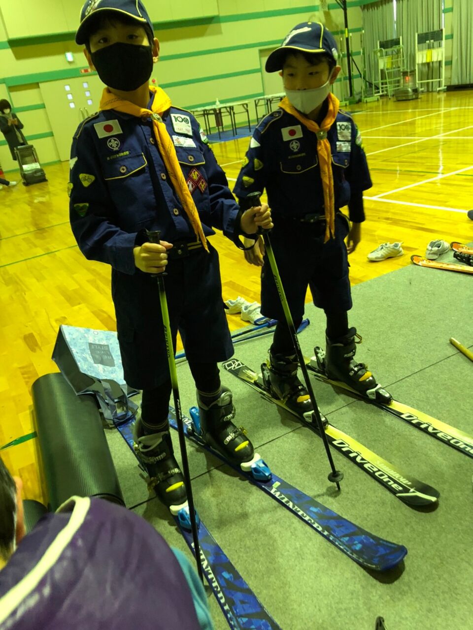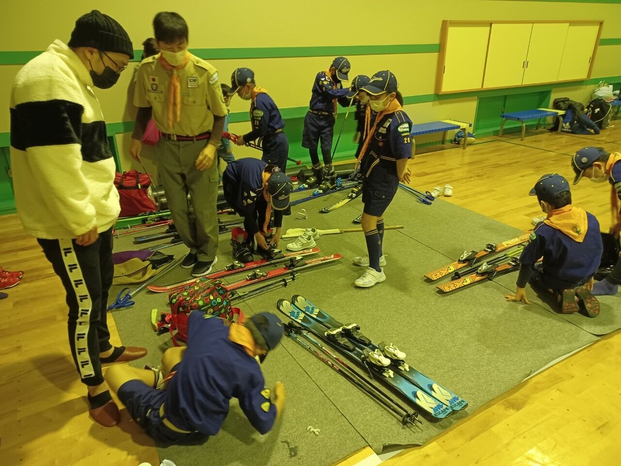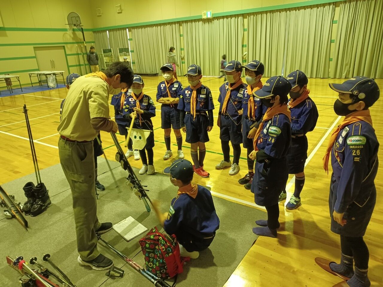 まず最初に隊長からスキーの注意点や道具の扱い方の話を聞きました。安全確認や危険予知についてもしっかり学んだ後、実際に持参したスキーを装着しました。スムーズにブーツを脱いたり履いたり出来たかな?次回のスキー訓練が楽しみですね。