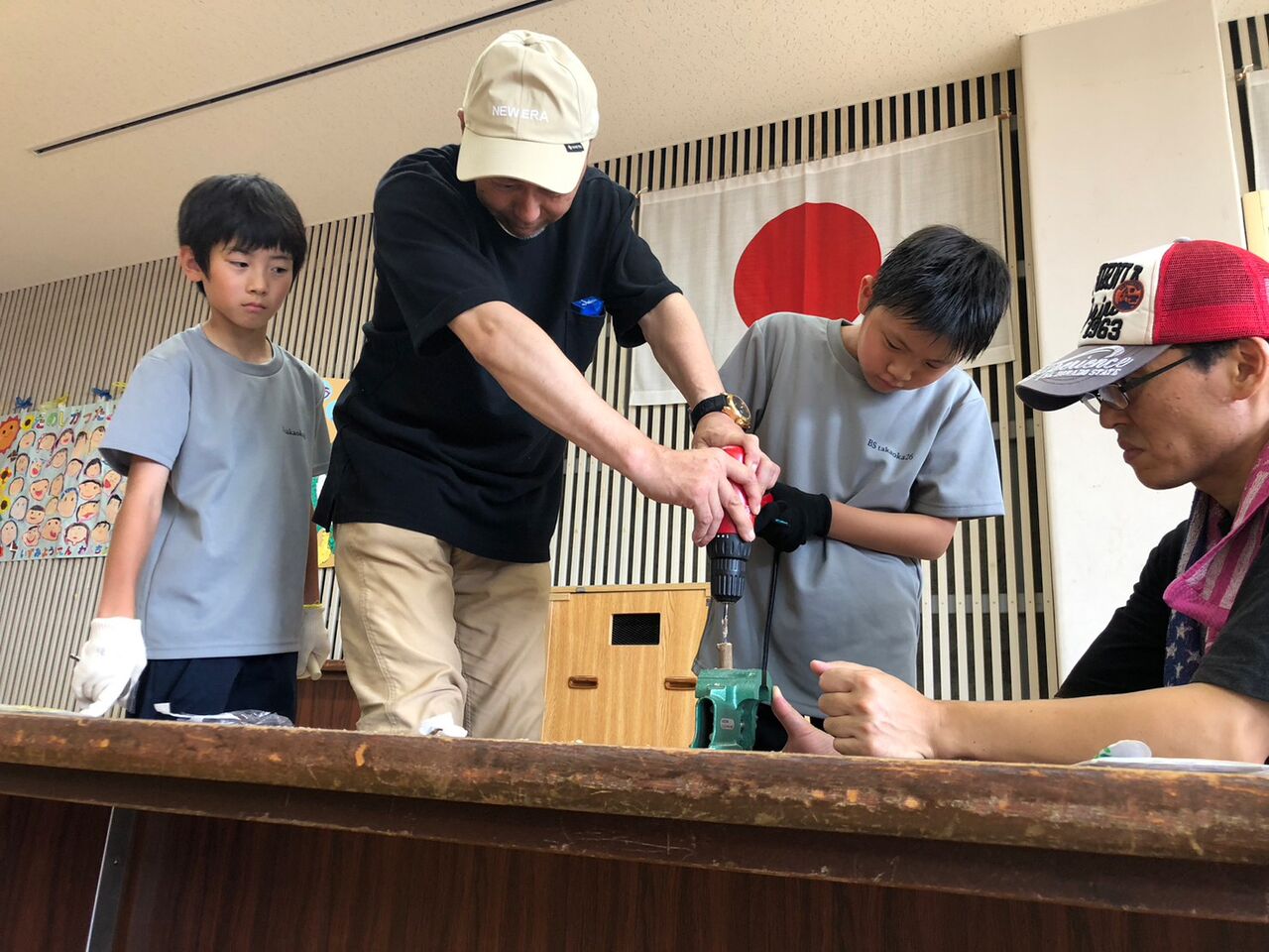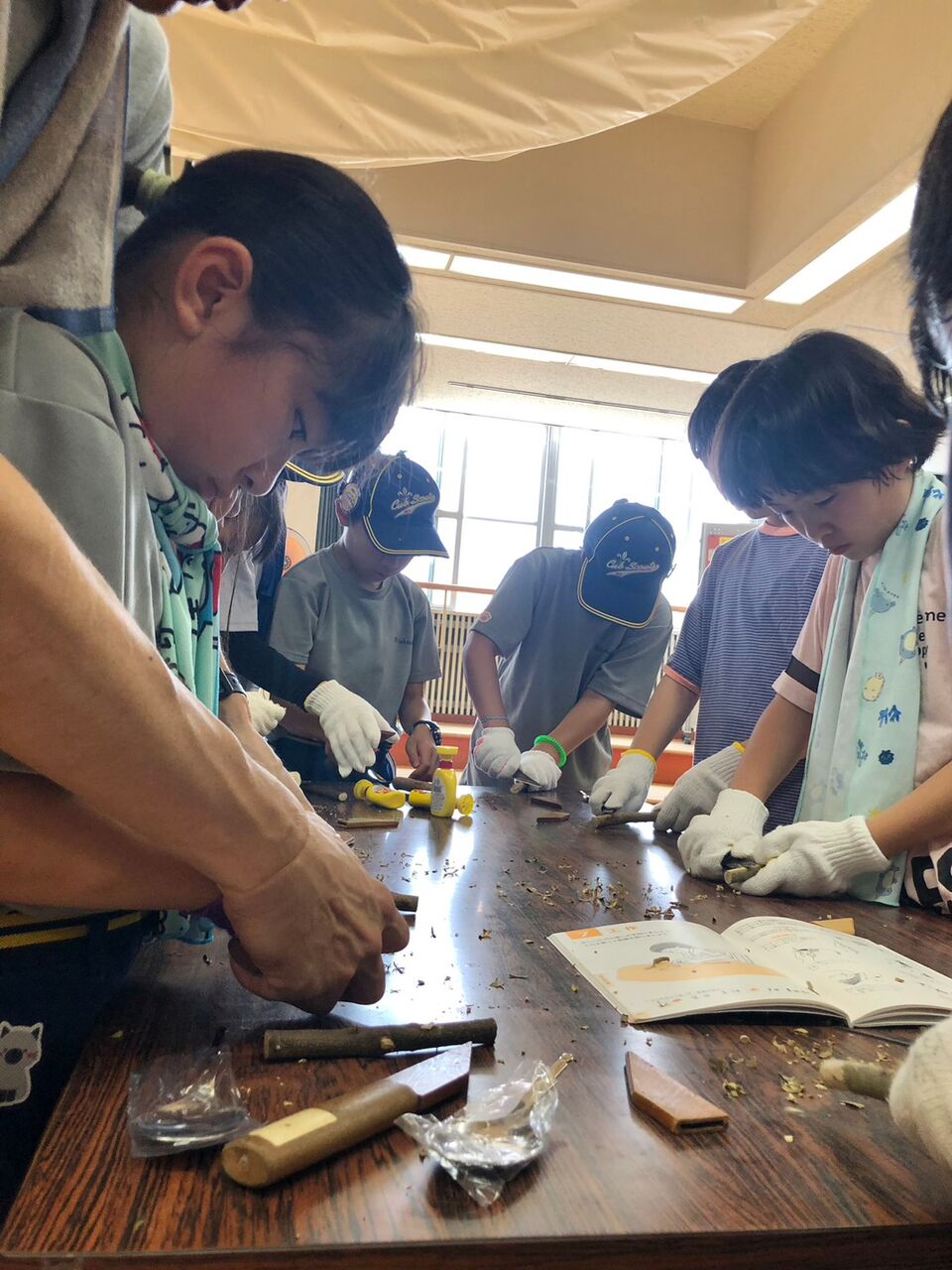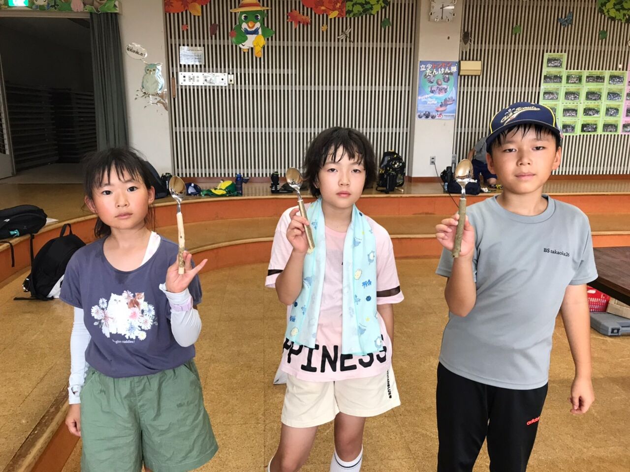 昼食を食べ終わると、スプーン作りを行いました。前回の活動で木の枝をノコギリで各々好きな長さにカットし、その枝をナイフや電動ドリルを使って加工して個性豊かなスプーンを制作しました!色々な長さや太さの枝で作ったスプーンはみんなのお気に入りになったみたいです。