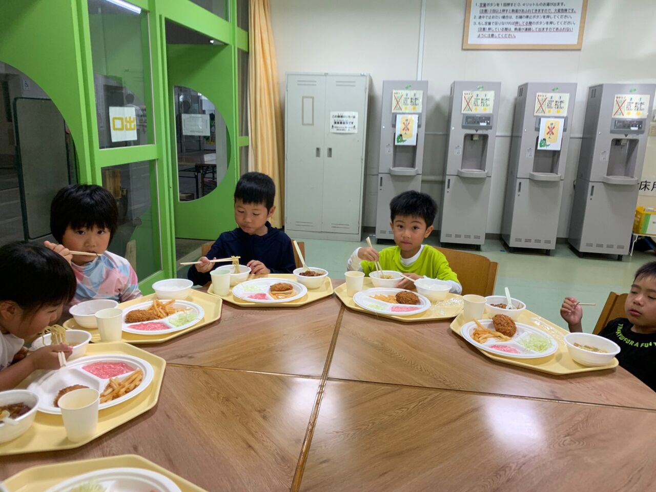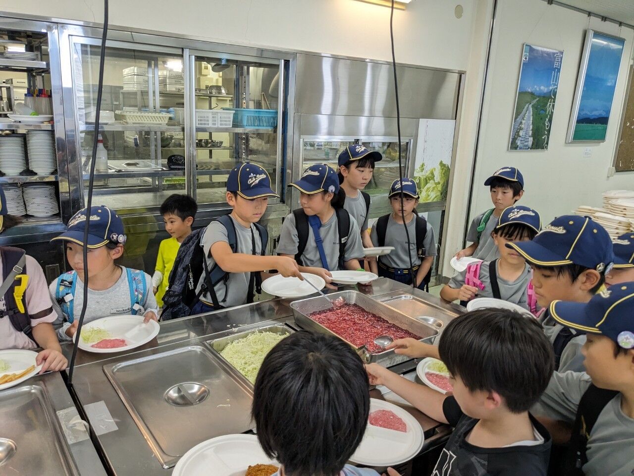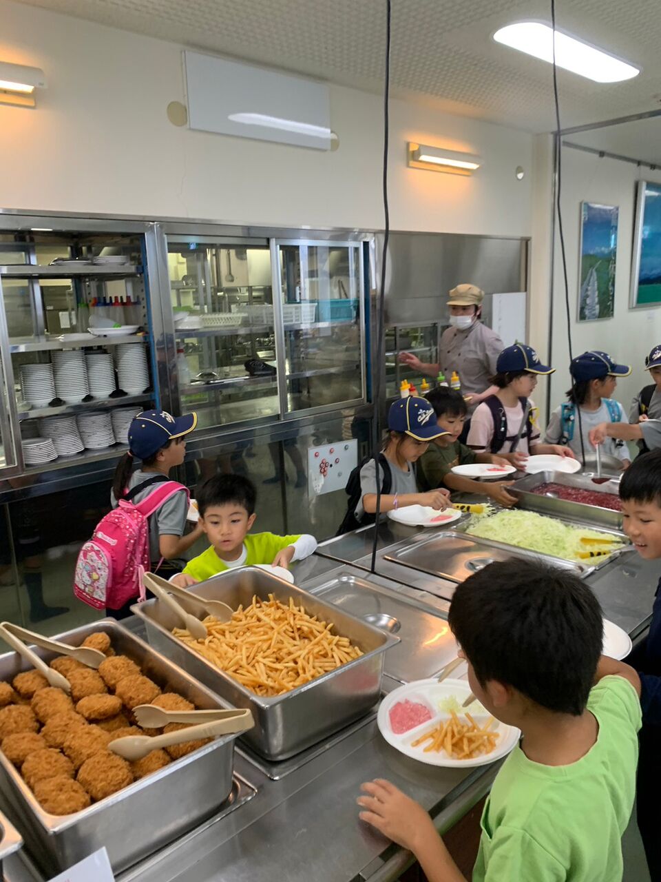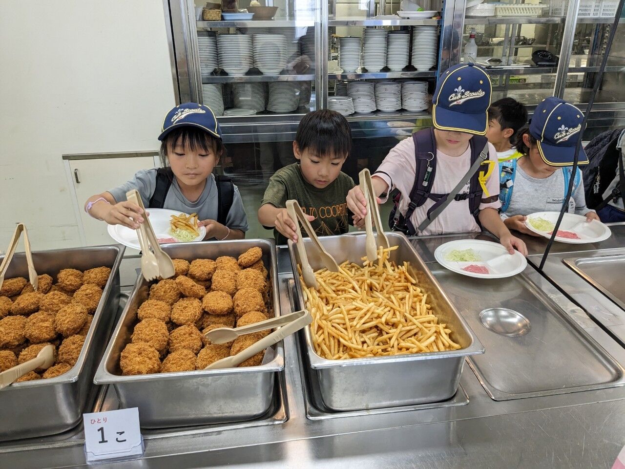 ゼリーやフライドポテトと野菜、ラーメンにハヤシライスと結構ボリュームのあるメニューで、バイキング形式なので各自好きな量を自分で取って食べました。ゼリーを一杯入れる子や、フライドポテトを山盛りに入れる子など、楽しんで取り分けていました。