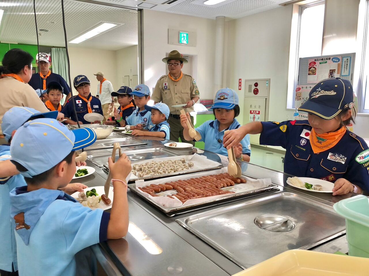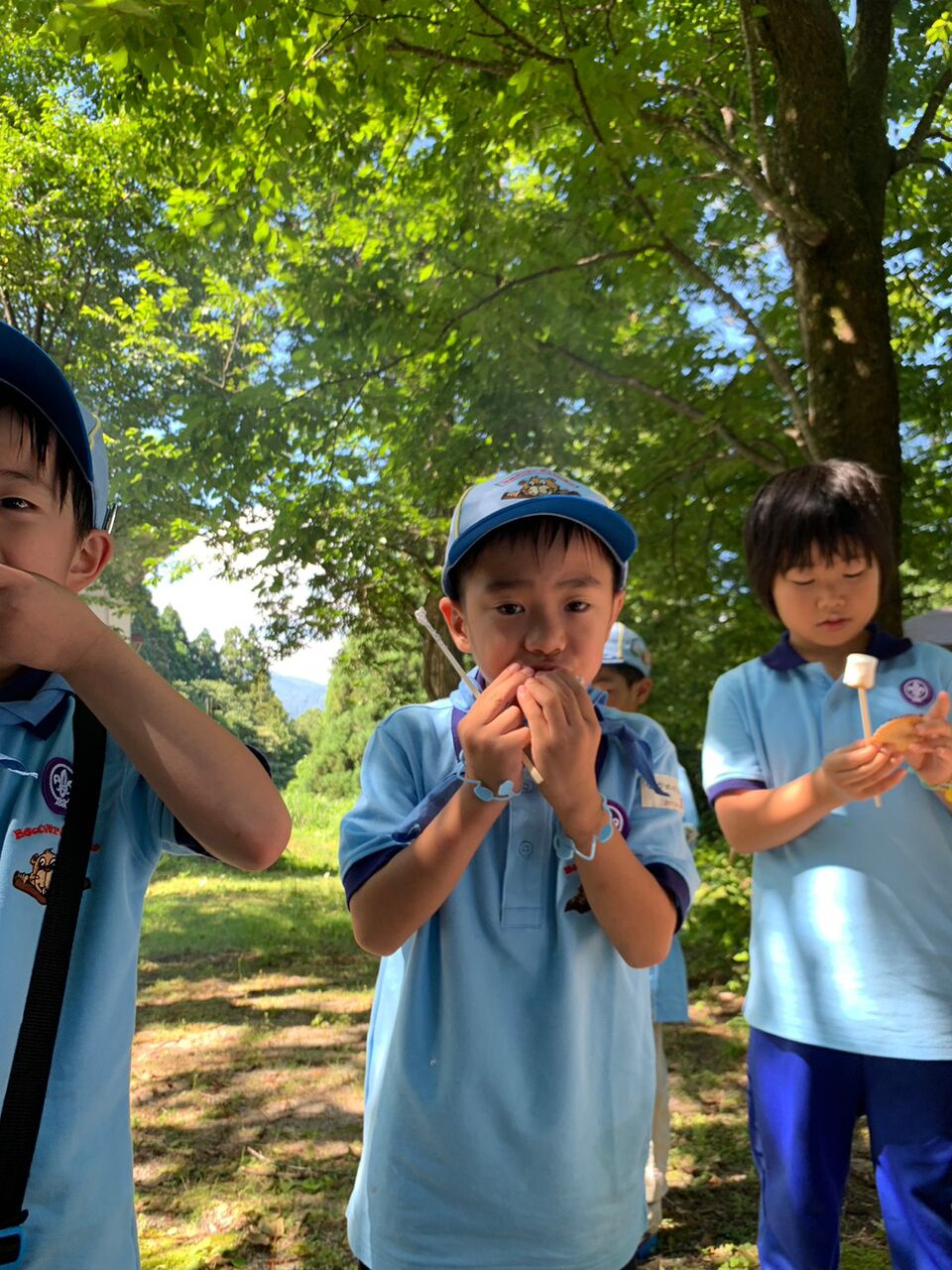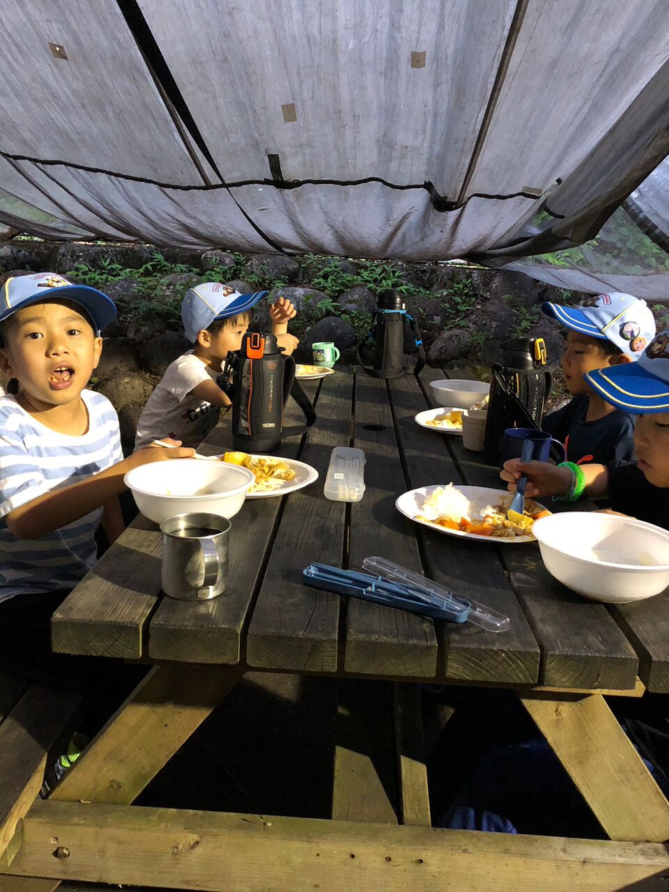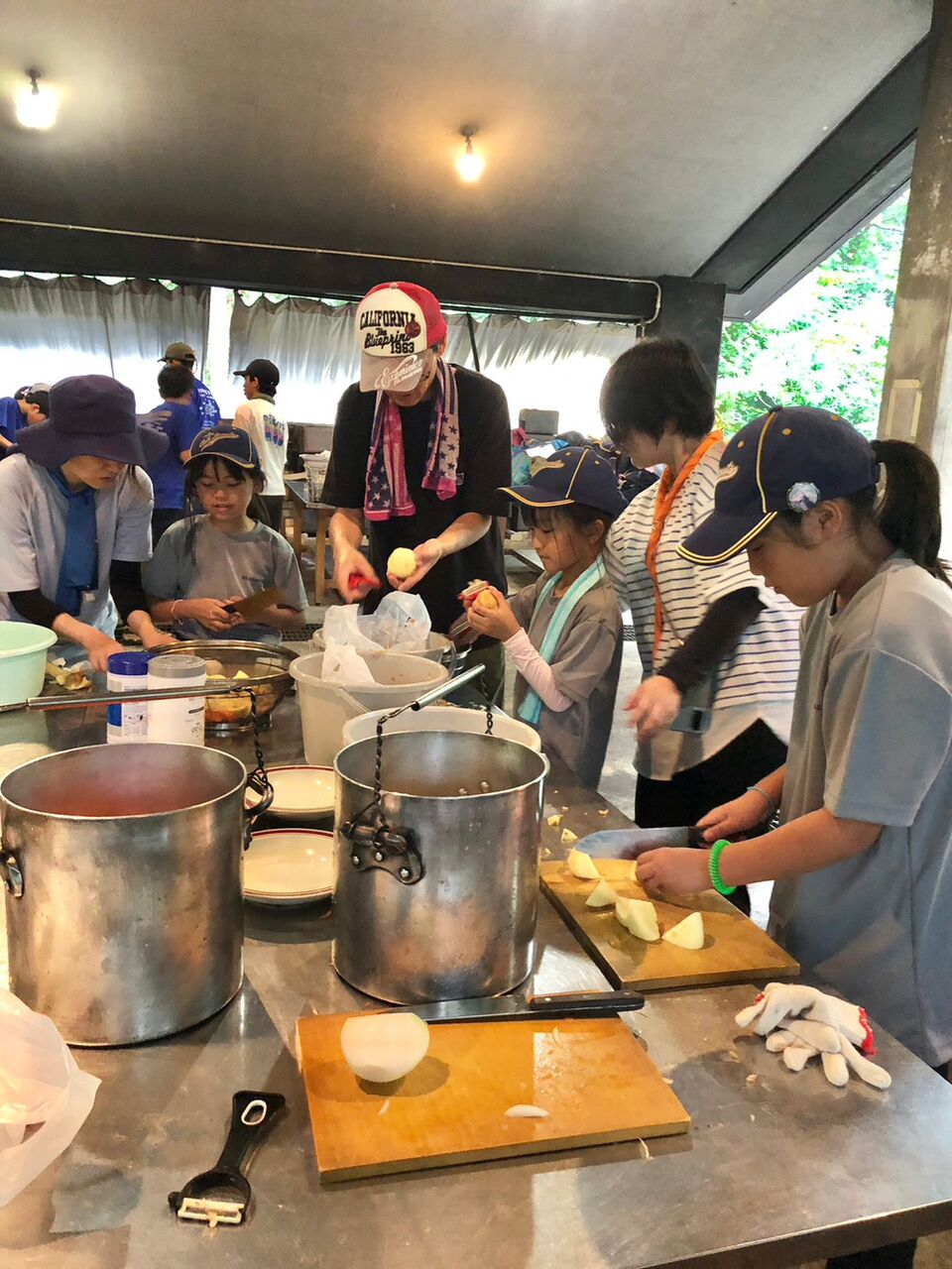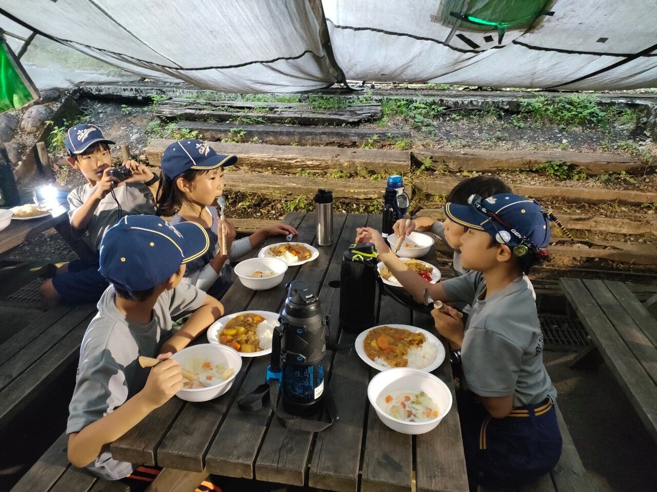 スプーンを作り終えると、いよいよ夕食のカレー作りに取り掛かりました!くまスカウトは薪で火をおこしてご飯を炊きました。米を研いで火にかけて、薪を継ぎ足したり鉄釜の様子を確認したりと一生懸命に取り組んでいました。しかスカウトとうさぎスカウトはカレー作り。じゃがいも、人参、玉ねぎの皮をむいて、食べやすい大きさにカットしたりと、皆で協力して頑張っていました!カレーが完成したら以外に量が多かったんですが、皆で協力してなんとか食べきる事が出来ました!とても美味しかったです。