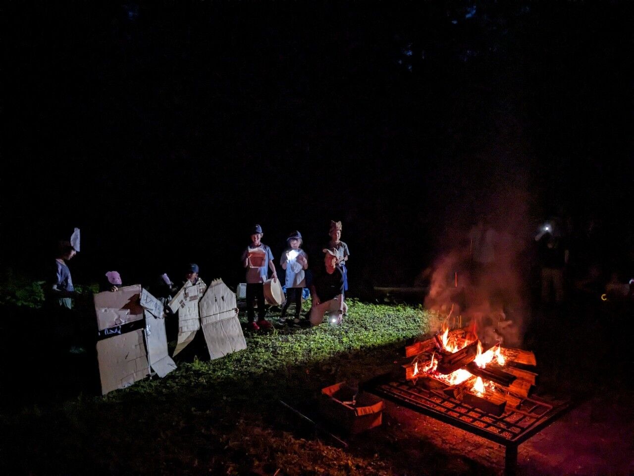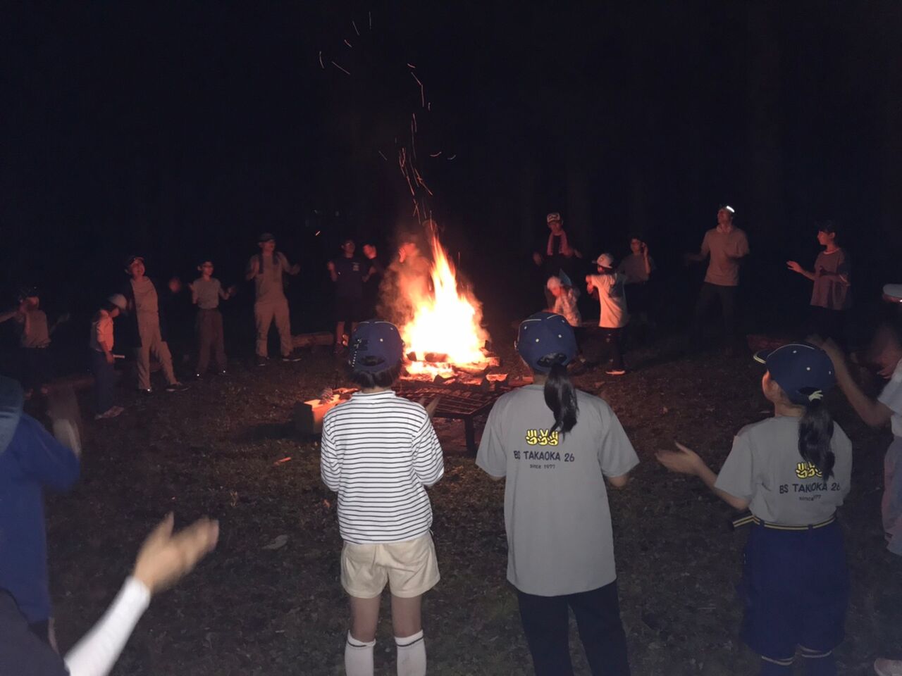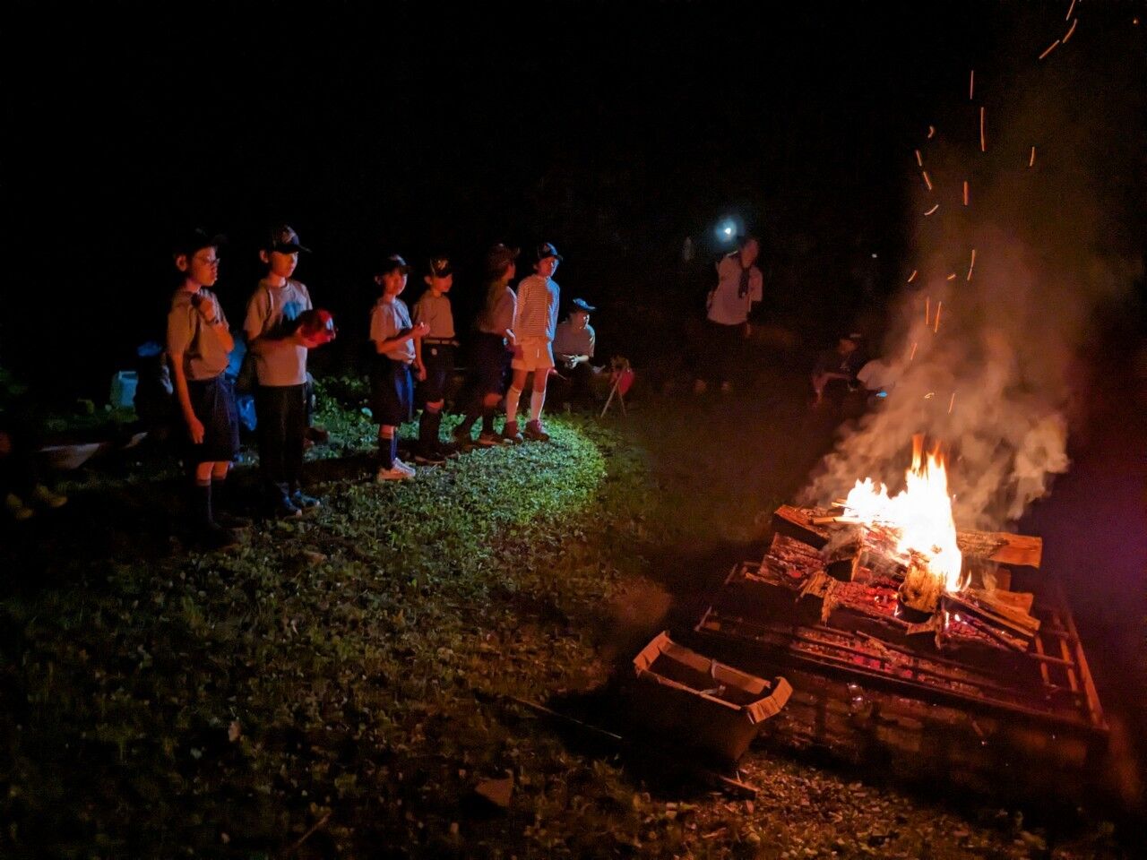 夕食も終わって、辺りが薄暗くなってきた頃、キャンプファイヤーを行いました。ビーバー、カブ、ボーイ隊の皆で火を囲んで、歌を歌ったり踊ったりと、楽しい時間を過ごしました。カブスカウトは、一組は前回の活動で制作したダンボール製の藁、木、レンガの家を使って三匹の子豚のスタンツを行いました。オオカミの息を吹きかけて家が飛んでいく様子や煙突に入ってから逃げていく様子がとても可愛く楽しめました!二組は爆弾ゲームを行いました。二組も前回の活動で制作した自家製の爆弾やダイナマイト!?を使用してゲームを行いました。二組の皆の歌に合わせて爆弾を皆で回して行き、笛が鳴ったときに持っている人がバツゲームといった流れのゲームでした。爆弾が回って来た人はすぐ隣の人に回す人もいれば、ちょっと長めに持って次の人に回す人など様々でハラハラドキドキでした。キャンプファイヤーの火が大分落ち着いて来た頃、団員長の話しがあり皆真剣な眼差しでお話を聞いていました。楽しかったキャンプファイヤーも終わりを迎え、風呂に皆で入って就寝しました。初めて泊まる子達もいて、ちょっとお母さんが恋しい子もいたみたいですが、皆疲れたのかぐっすり眠れたみたいです。
