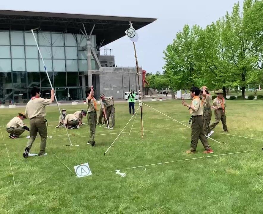 最後は、宇宙遊泳をイメージしたゲームが行われました。スカウトたちは仮想の宇宙空間を事前に学んだロープワークを駆使して探検し、ミッションとした積み木の高さ競っていました。スカウトたちはこのゲームに夢中になって取り組んでいました。楽しみながらも、チームワークを深めることができたようです。