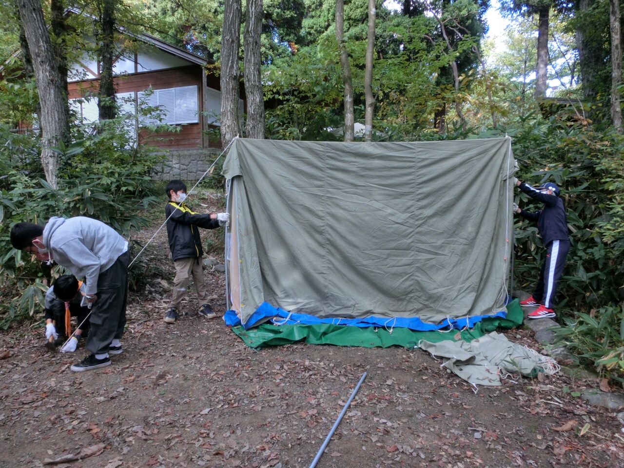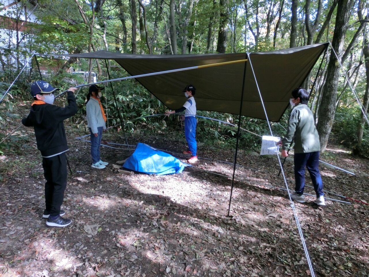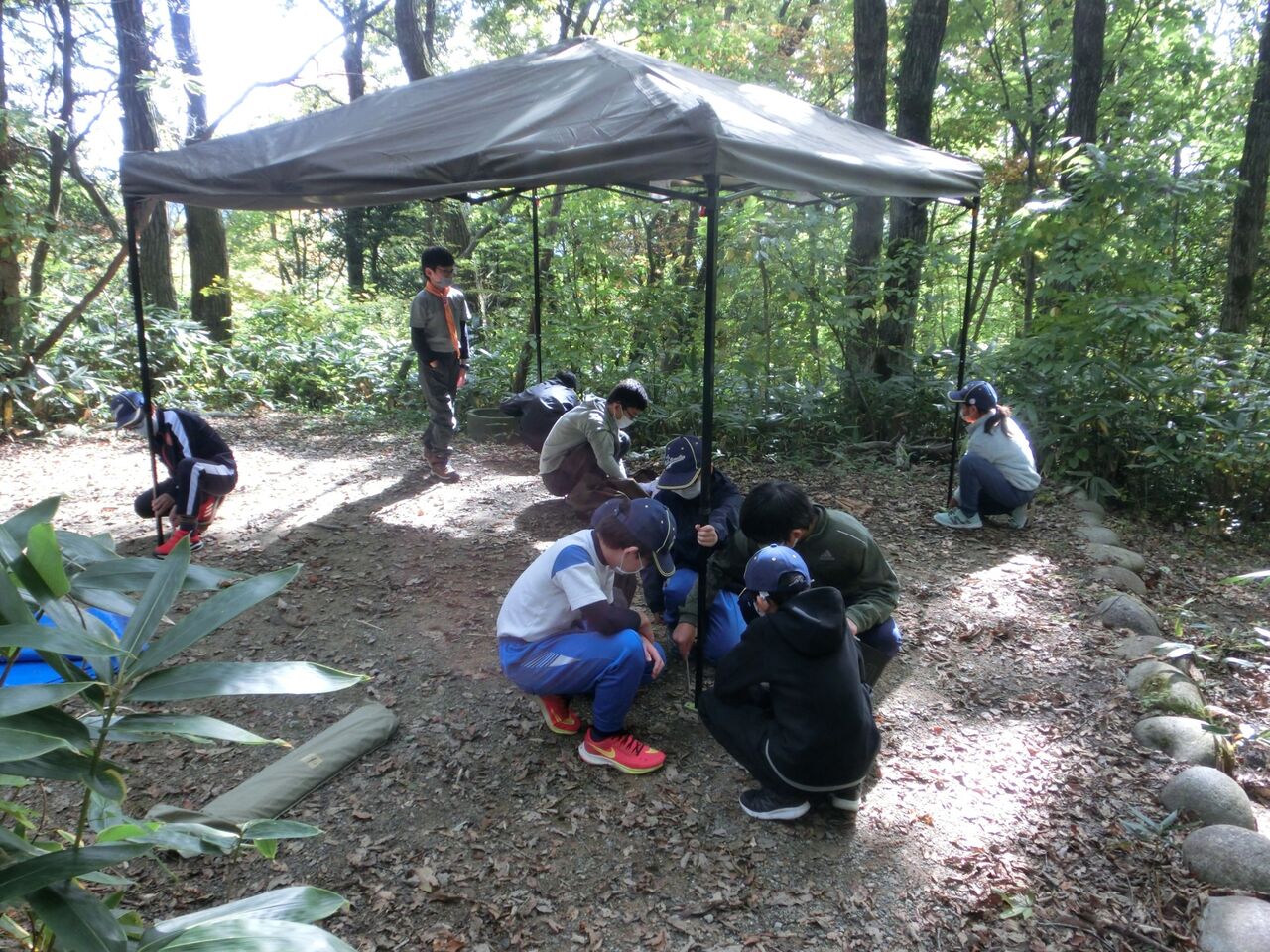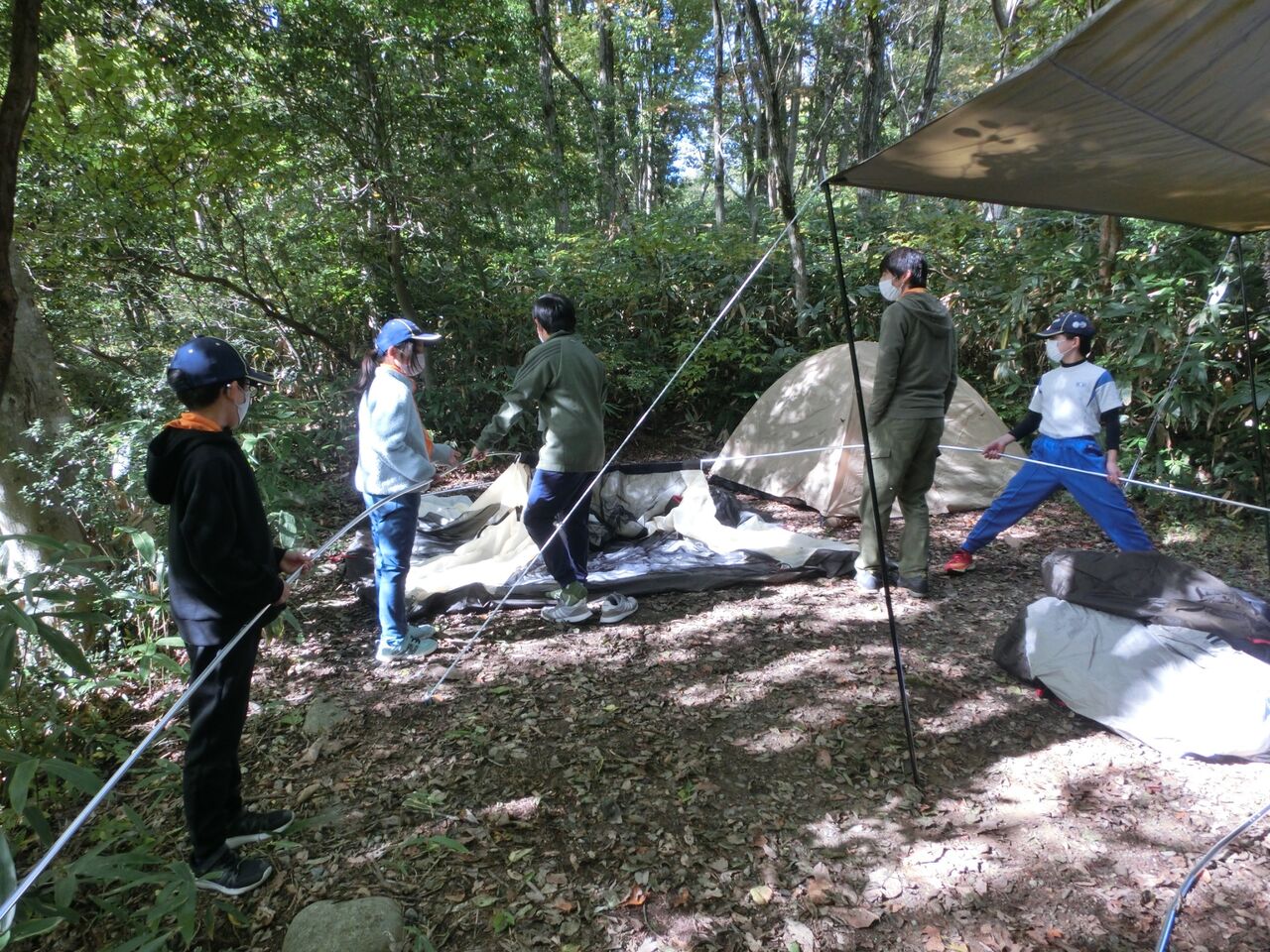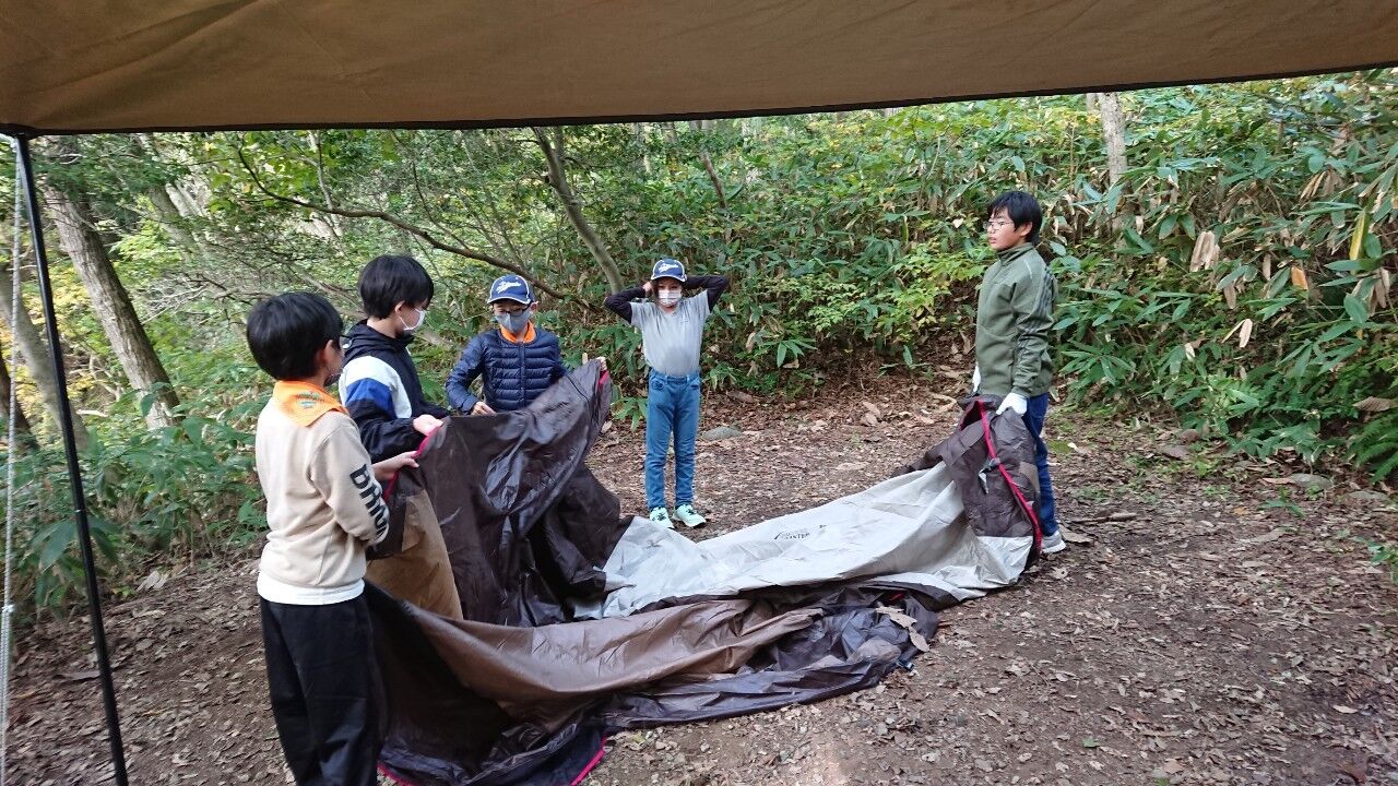 昼前に野営場に到着したら弁当を食べて、腹ごしらえ。作業着に着替えて作業開始!2班に分かれ、ボーイとカブが力を合わせて、タープとドームテントをそれぞれ2張りとA型テントを1張りの設営です。「こっちに来て、これ持って」「こうするといいよ」ペグを打つ位置、打ち方を分かり易くボーイが指導し、カブスカウト達は「はい!」と、とてもいい返事をして、「楽しい!!」という声が聞こえたり、とてもいい雰囲気で一生懸命に取り組んでいました。