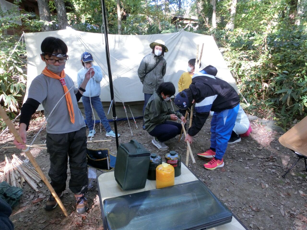 次は、たちかまどを作ります。竹の長さを見ながら細いロープひもで、まずは角しばりで固定。しっかり結ばないと、ぐらついて自立しません。今回、カブスカウト達は補佐役ですがボーイになったら自分達で作ります。ちょっとだけボーイの気分を味わった体験でした。
