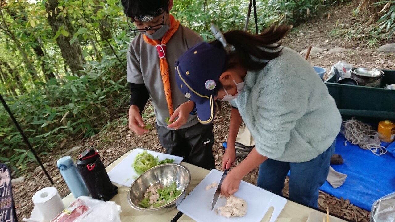 みんなの頑張りで順調に設営は完了し、お楽しみの夕食準備です。メインは生姜焼き!!飯盒で白米を炊いて、小松菜と豆腐の味噌汁に団委員長お手製のハーブサラダチキン添え♪森の中でテーブル囲んで食べる夕食。「美味しい!!」の声がたくさん聞こえた賑やかなひと時でした。