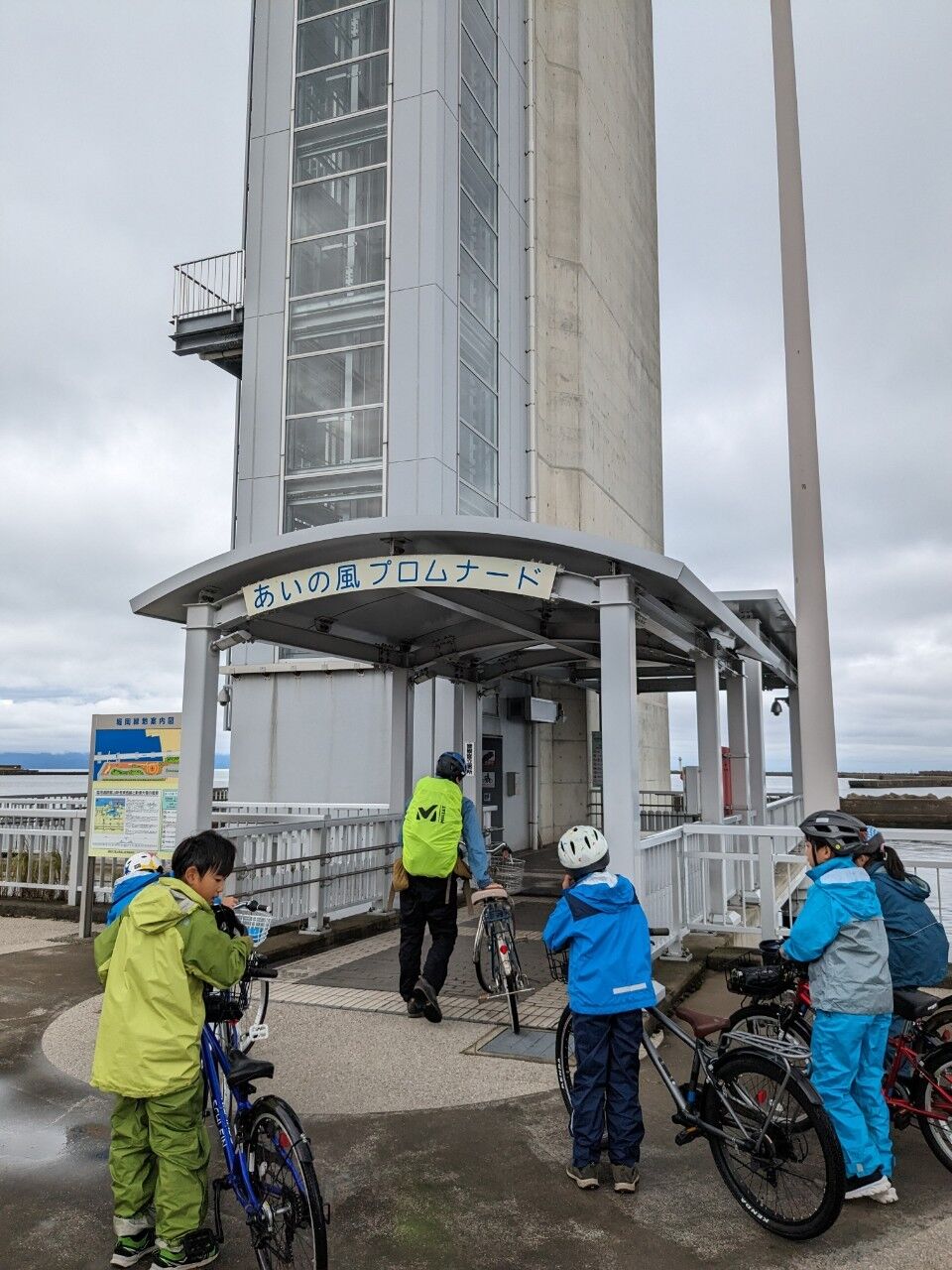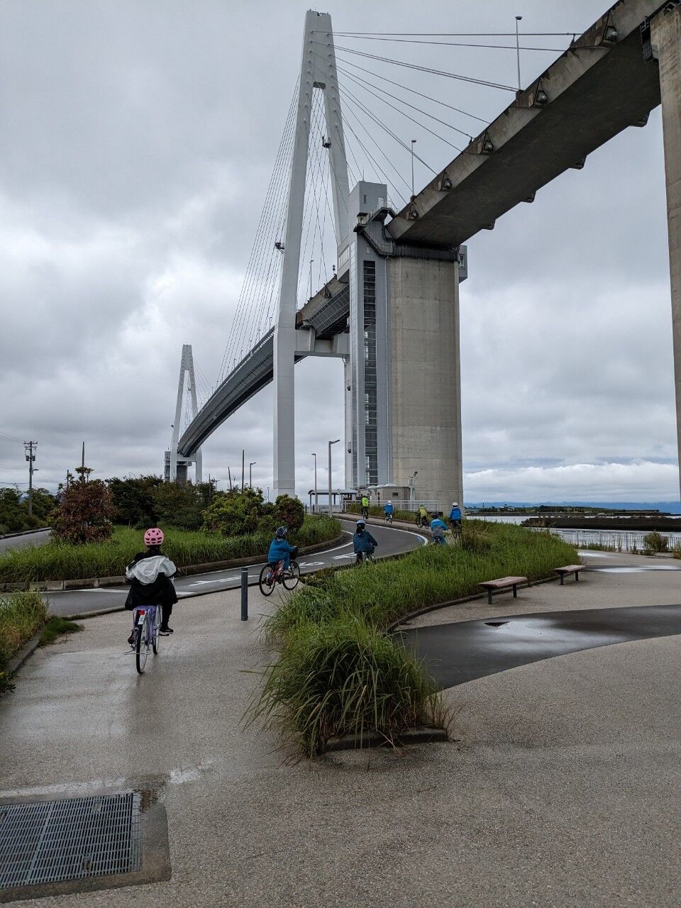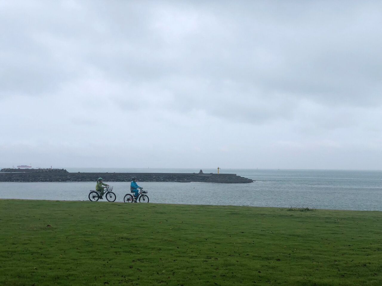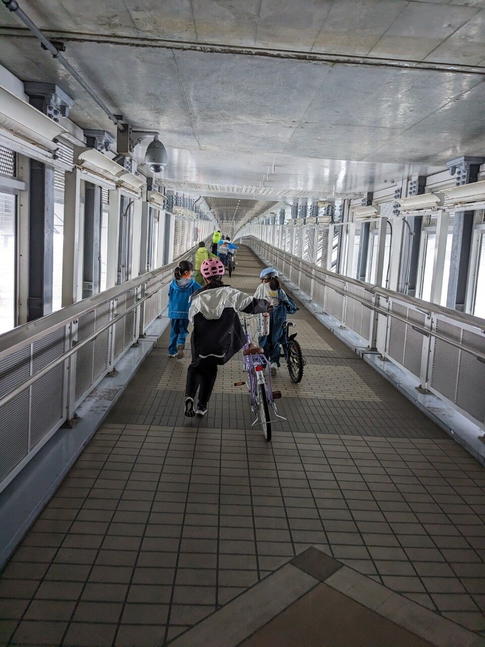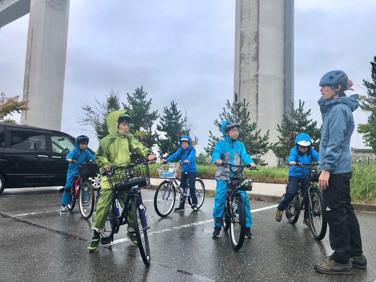 天候は雨…。みんな楽しみにしていただけにちょっと残念そうでした。でも、雨にもかかわらずみんな元気一杯で早く出発しよう!とやる気満々でした。カッパを着て、プロムナード堀岡から海老江海浜公園に向かって出発。あまり経験した事が無いであろう雨の中を、隊長の指示の中交通ルールを守りながら目的地に向かいました。