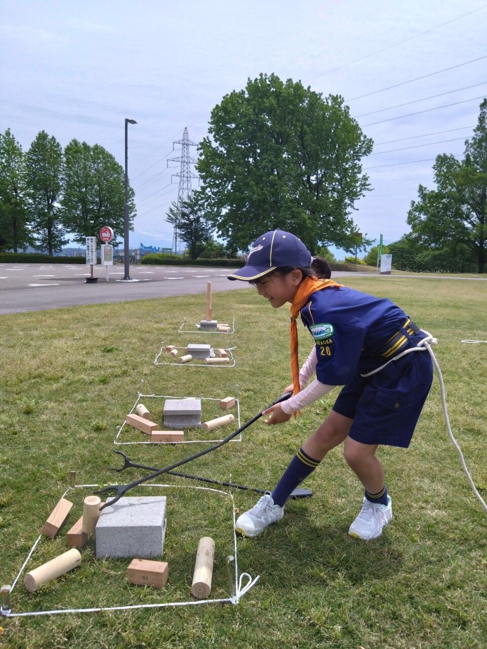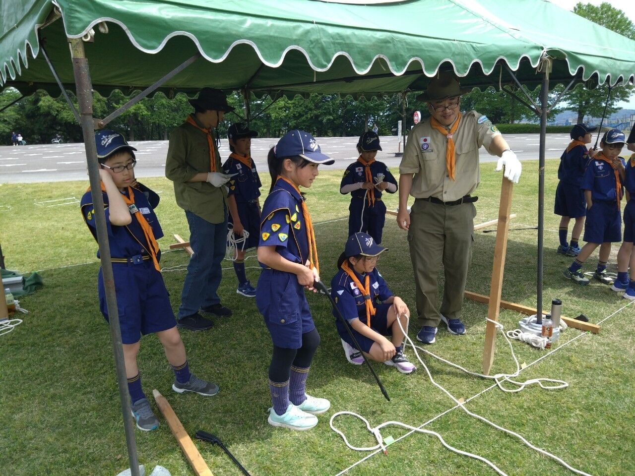最後は、宇宙遊泳をイメージしたゲームが行われました。スカウトたちは仮想の宇宙空間を事前に学んだロープワークを駆使して探検し、ミッションとした積み木の高さ競っていました。スカウトたちはこのゲームに夢中になって取り組んでいました。楽しみながらも、チームワークを深めることができたようです。