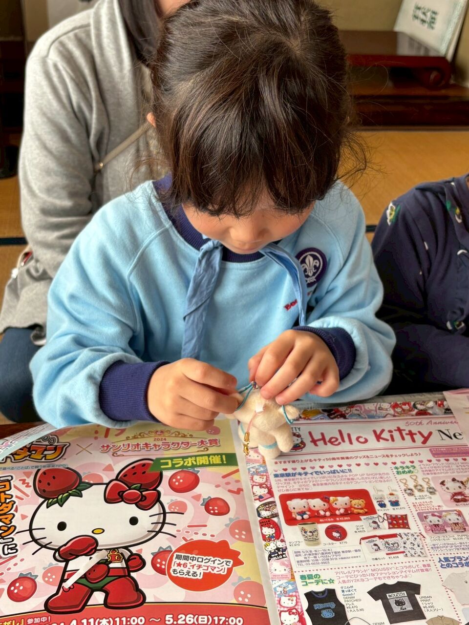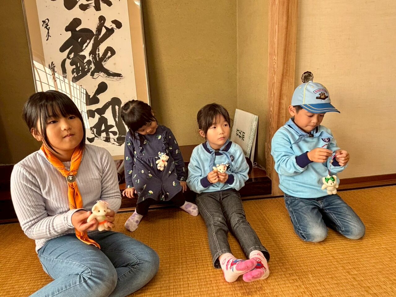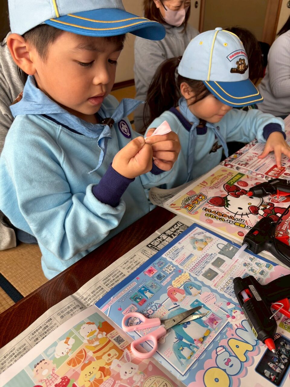 くまさんの飾り付けも楽しみました。カラーゴムをつけるのはロープワークにちょっと似てたね。