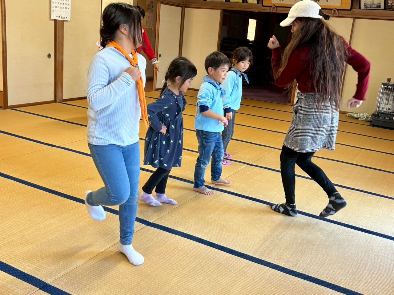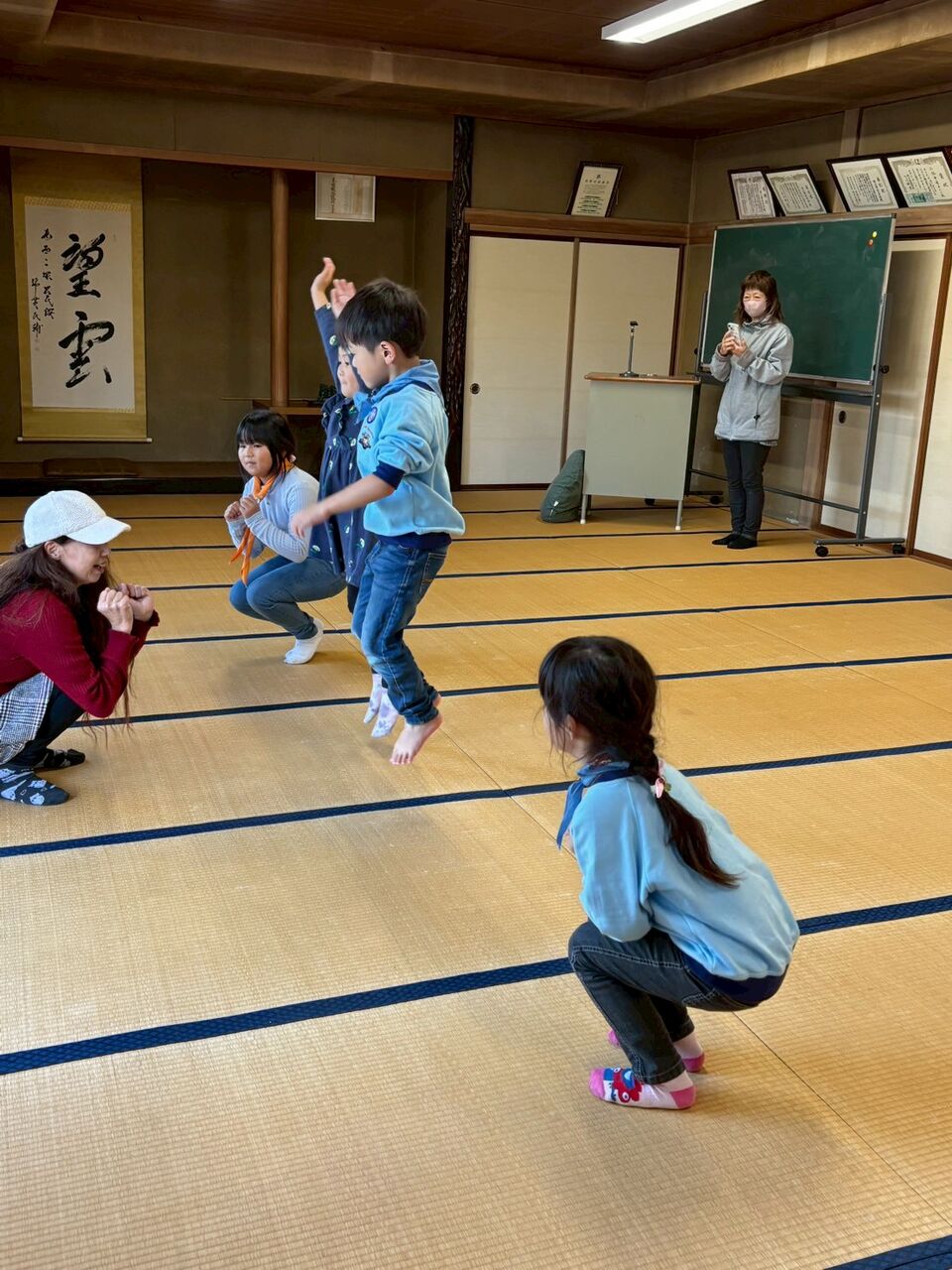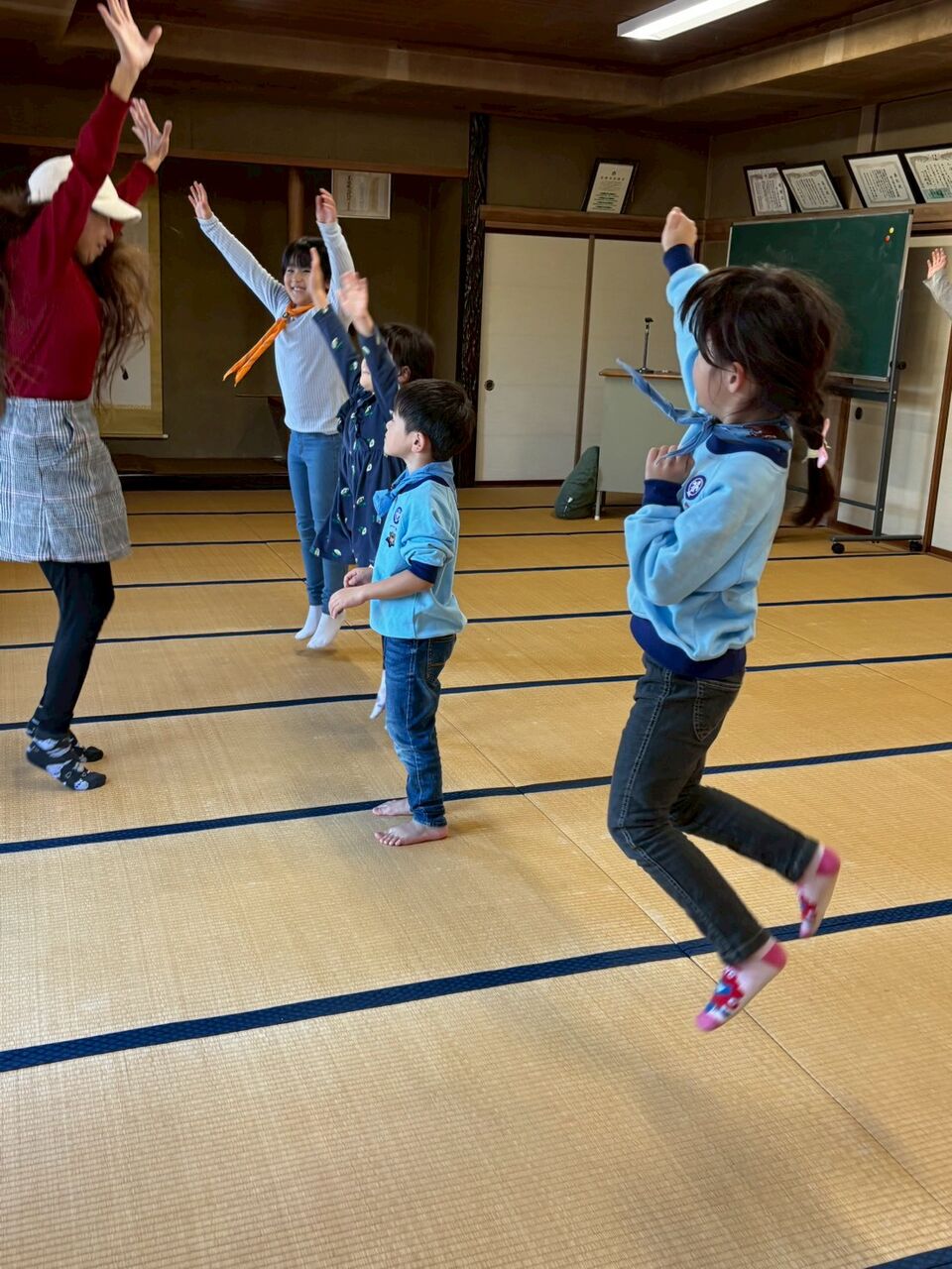 最後に音楽に合わせてリズム体操。先生の真似をしながら、ボックステップやターンもみんな上手!さんさん体操も元気よく♪