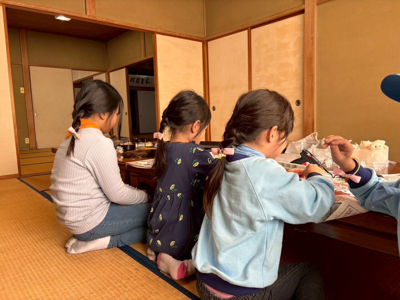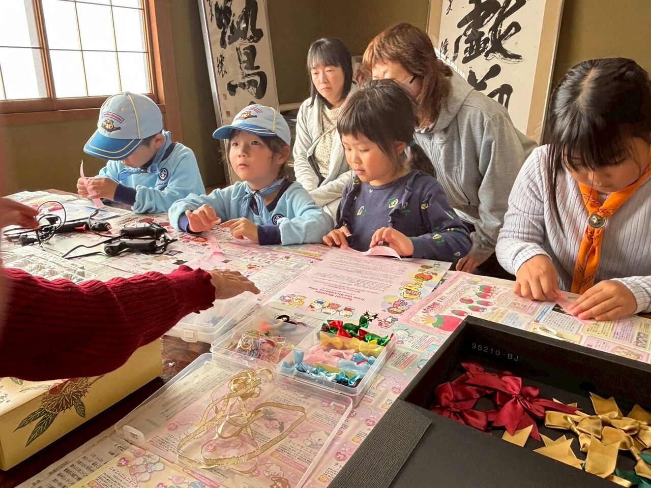 まず基本のリボンの作り方を学びます。折り紙のように折って魔法の糸で縛り、真ん中に飾りつけ。ゴムをつけて髪飾りにも。みんなでつけるととても可愛いです。