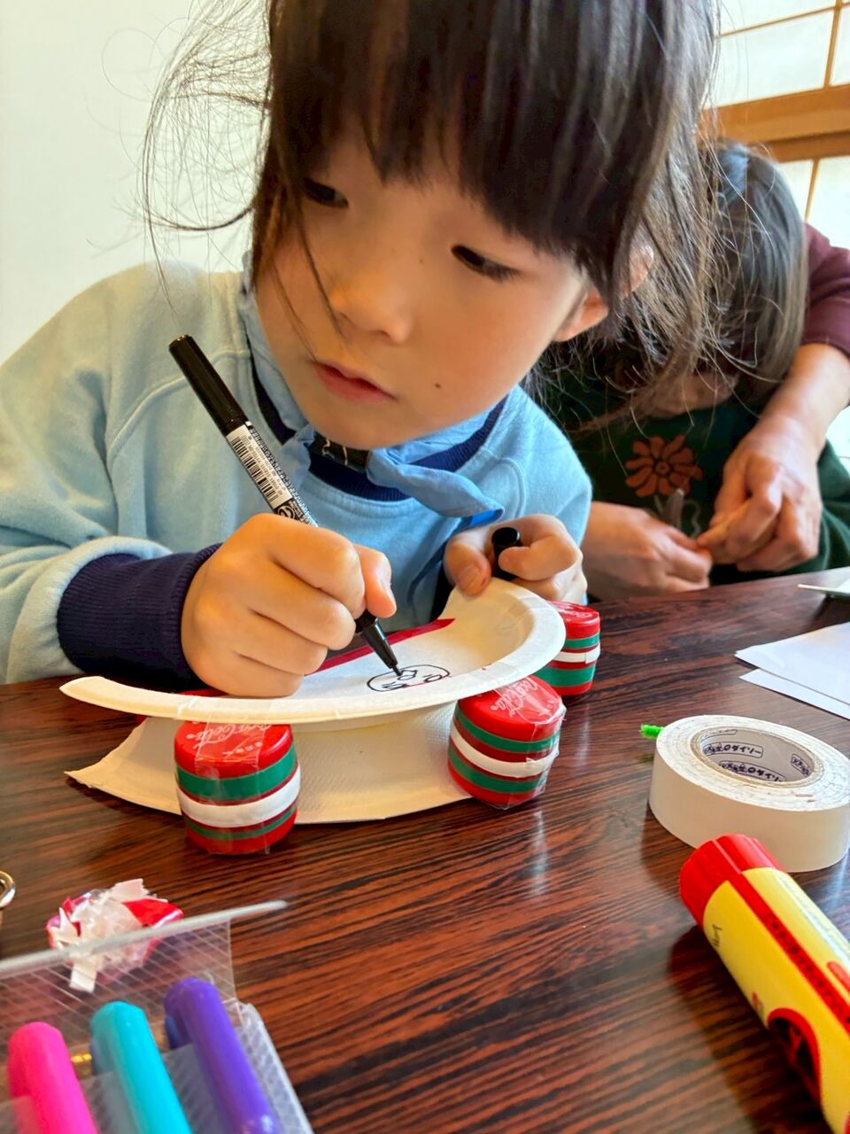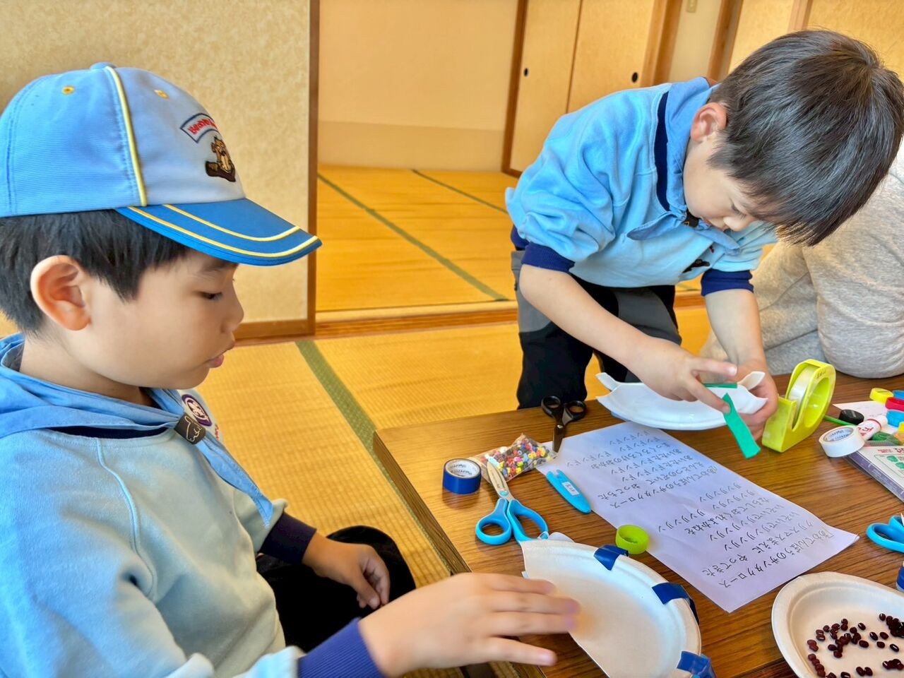 演奏用の楽器を2つ手作りしました。タンブリンは何を中にどれくらい入れたらよいか、スカウトに考えて作ってもらいました。カスタネットとタンブリンそれぞれに絵を描いたり、クリスマスデコレーション!