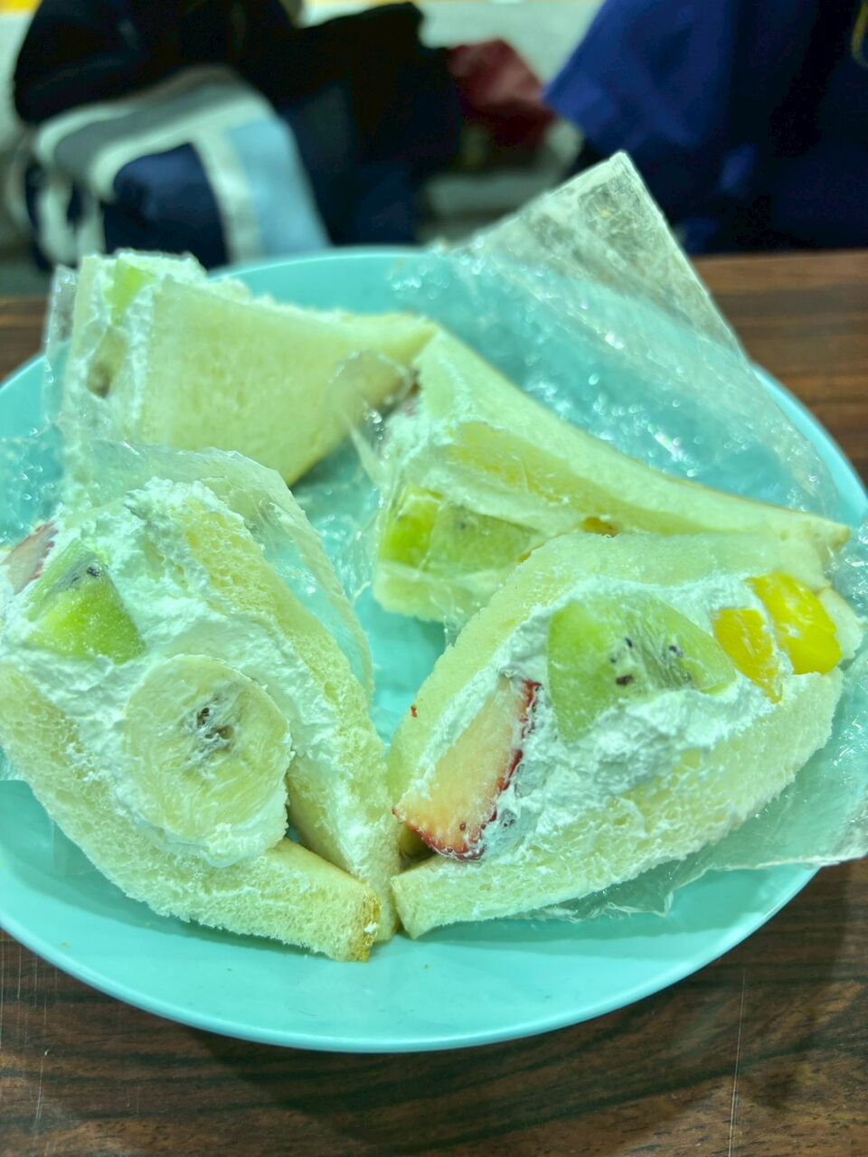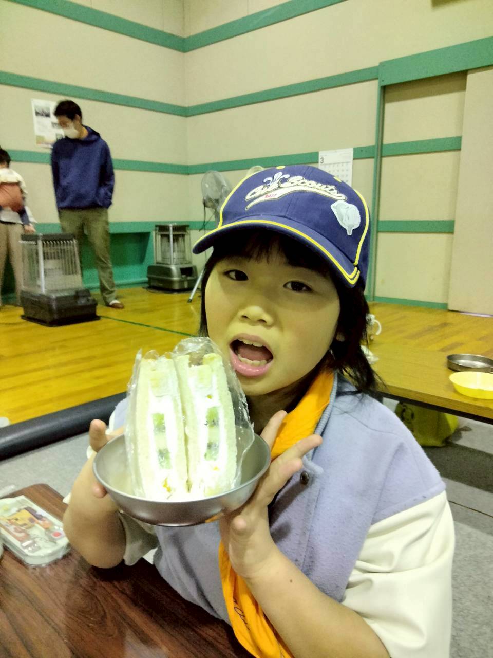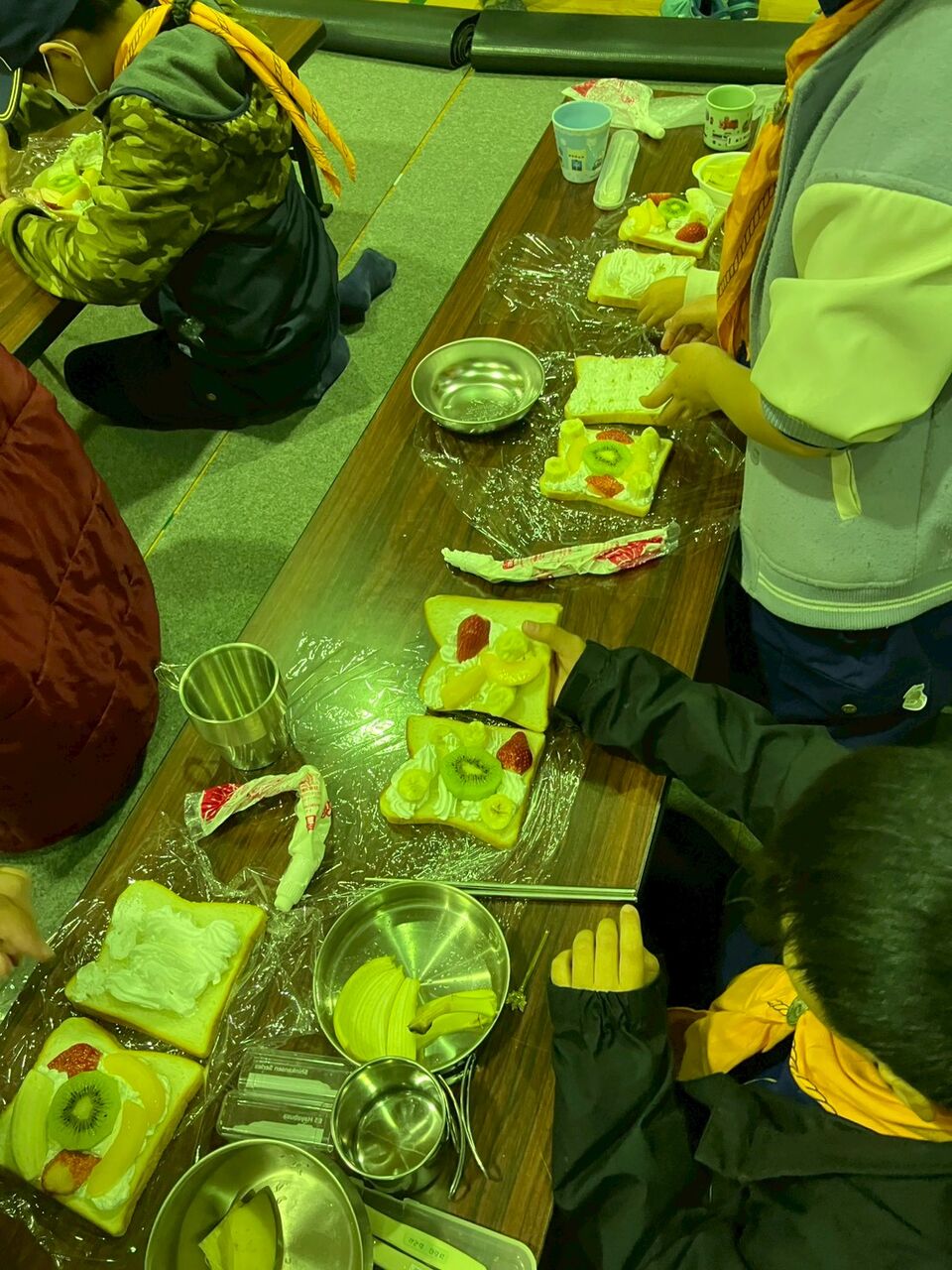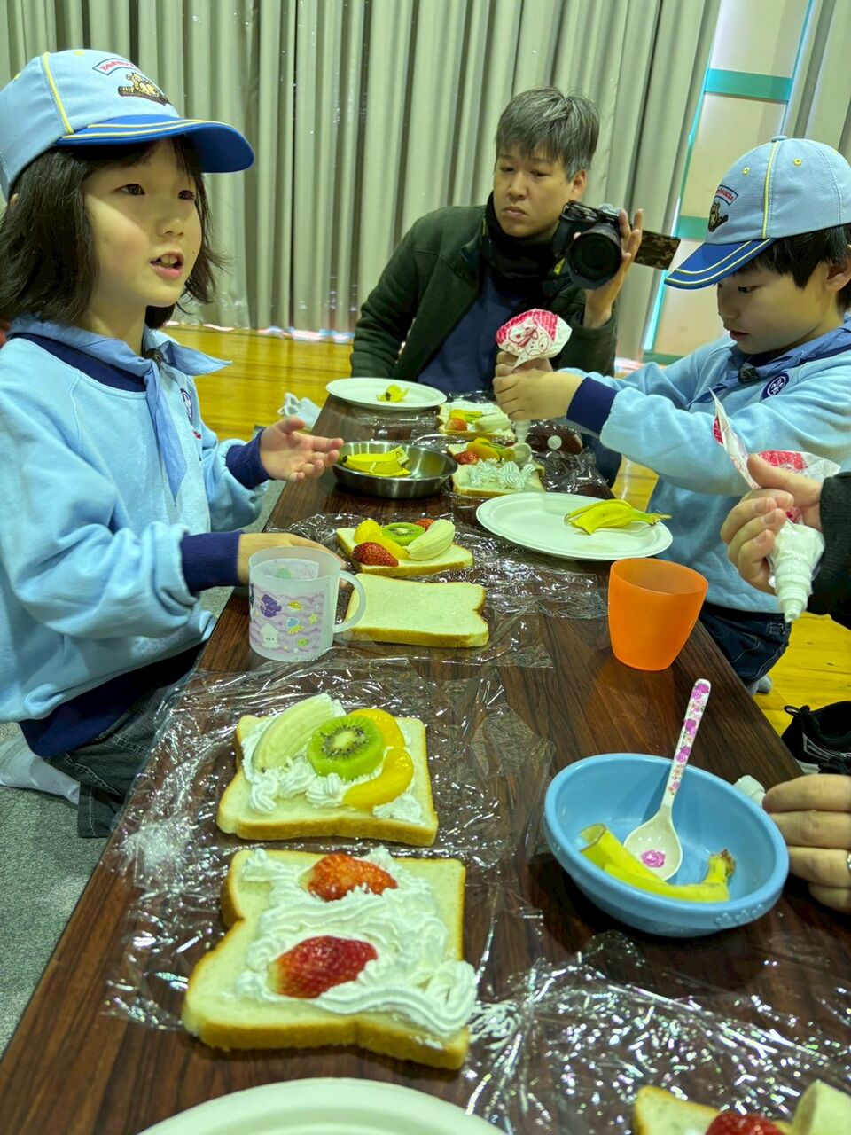 後半は、フル―ツサンド作りです。団委員さんに作り方を教えてもらって自分達で作ります。パンにクリ―ムと、キウイ 黄桃 バナナ イチゴ と沢山のフル―ツを挟みました。団委員のお母さん 食べやすいように全員のパンを包丁で 綺麗に4等分してくださいました。フル―ツもクリ―ムも甘くて美味しかったです。