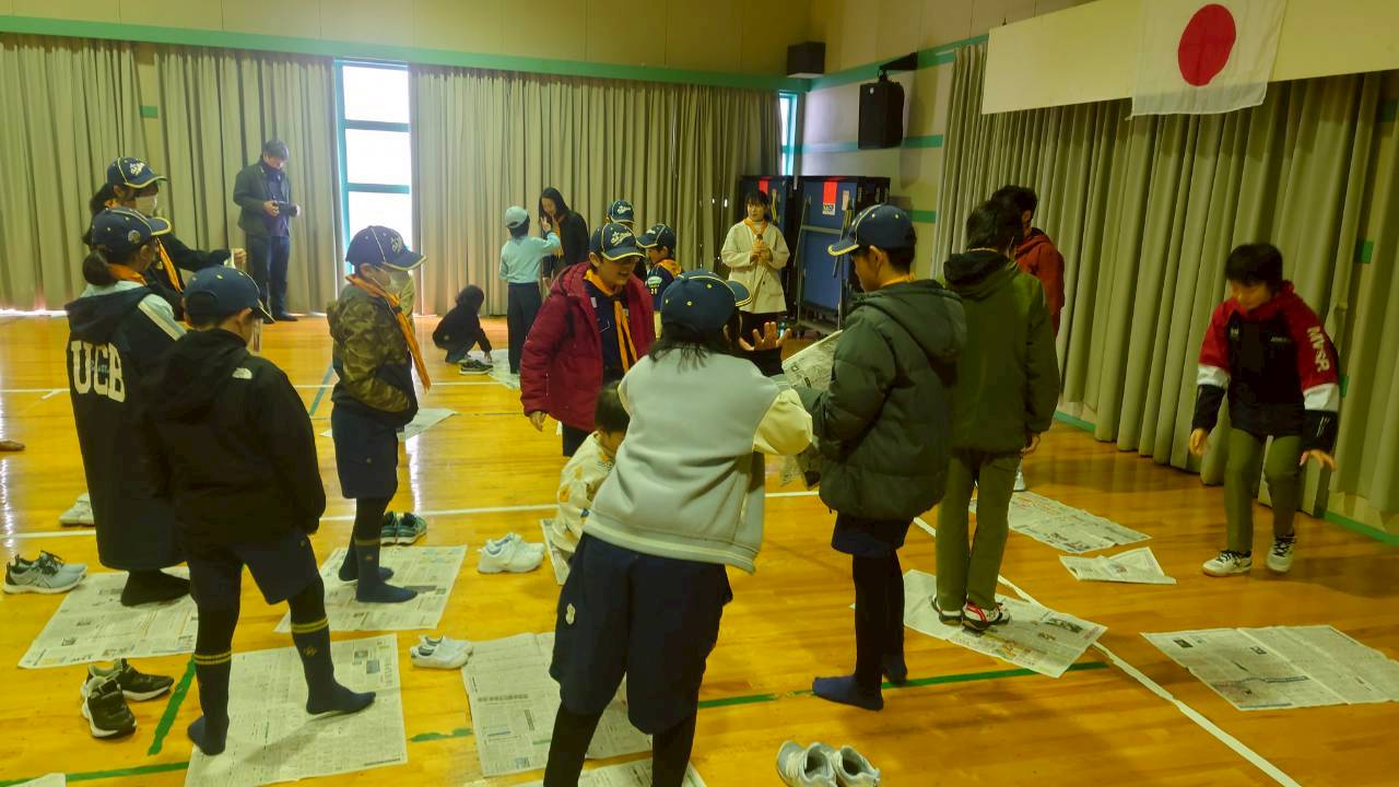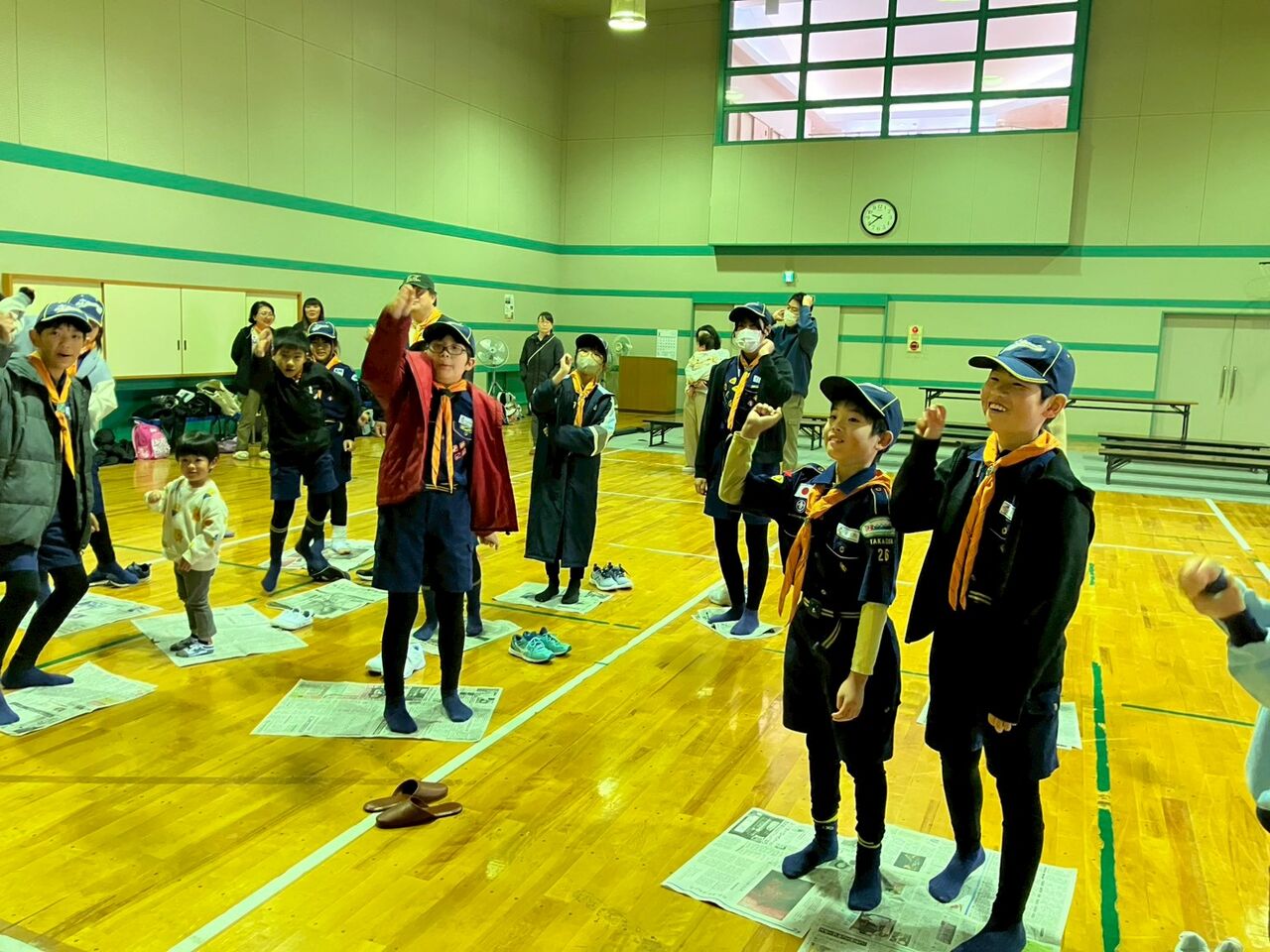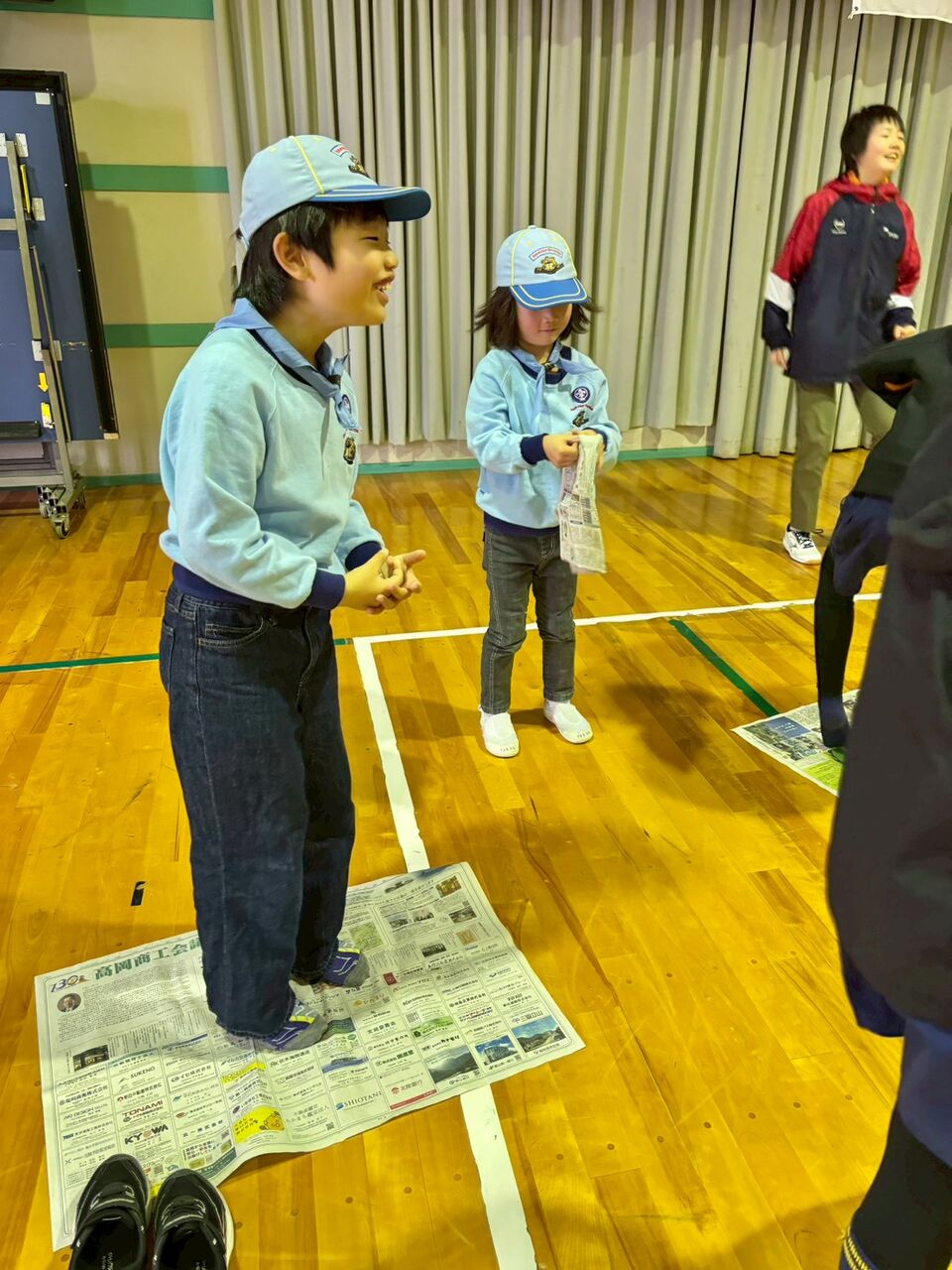 頭を使った後は、もう一度ゲームです。新聞紙島の生存ゲーム。ジャンケンで負ける度に自分の島が小さくなっていきます。ハラハラしたり、島から落ちないようにバランスをとったりしてお腹が空きました。ボ―イ隊 素晴らしいプログラム構成です!