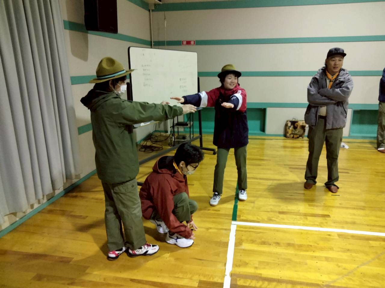 矢野副長が 狼!と叫べば リスが別の木の間へと走って逃げます。木こり!と叫べば 木が別のリスの元へ逃げます。嵐!と叫べば みんなが逃げて別の場所で木2本リス1匹のセットになります。元気に走り回り、体が温まりました。